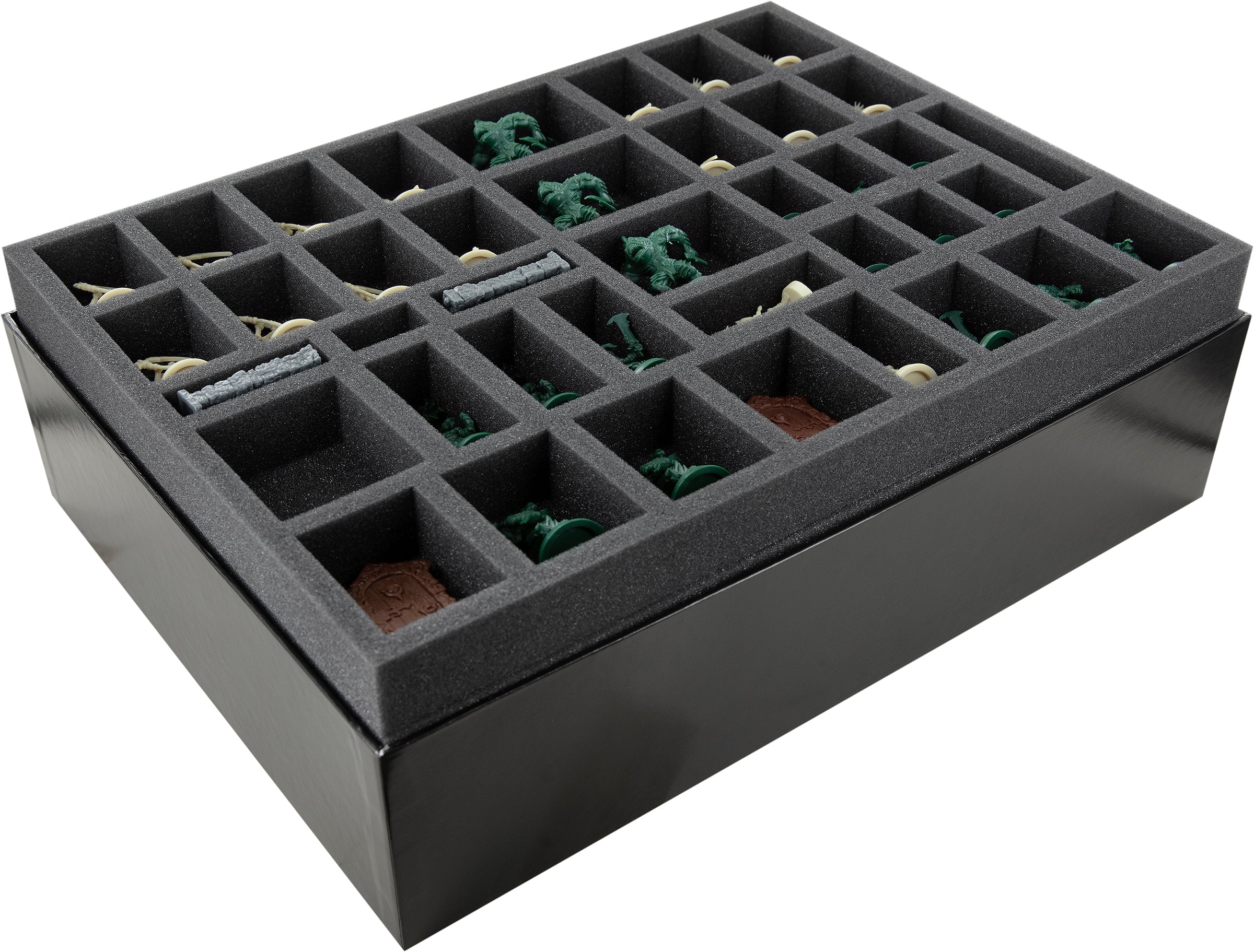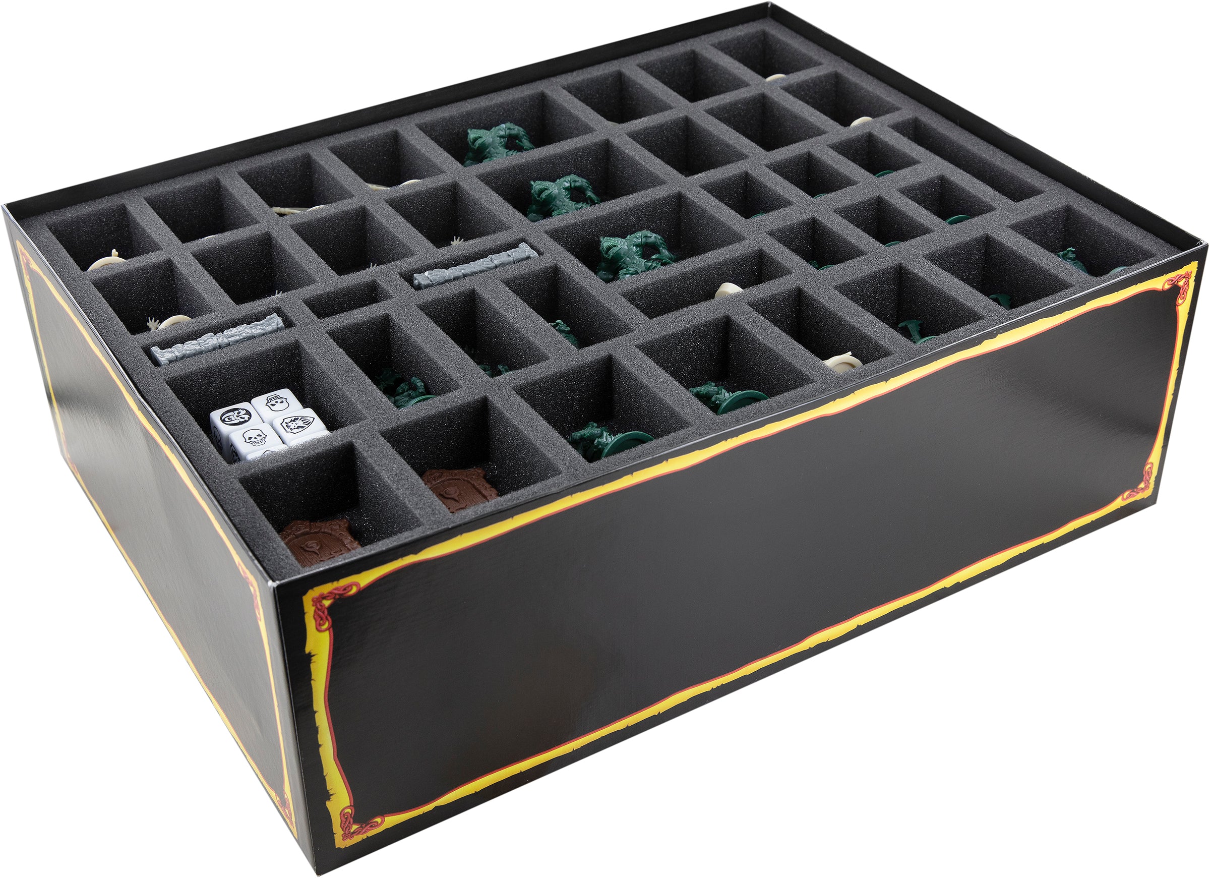Whether it's a stubborn dwarf, a stone door, or a fearsome gargoyle, all hero and enemy models, as well as all-terrain parts, get an own custom-fit cut compartment. Decorative elements like rats or skulls can be stowed directly with the associated terrain parts or separately in one of the free compartments.