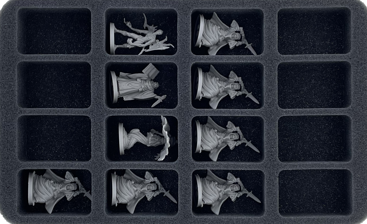 - 1 Half-Size foam tray with ten compartments for bulky 28 mm tabletop and board game miniatures (HS050BF05BO)