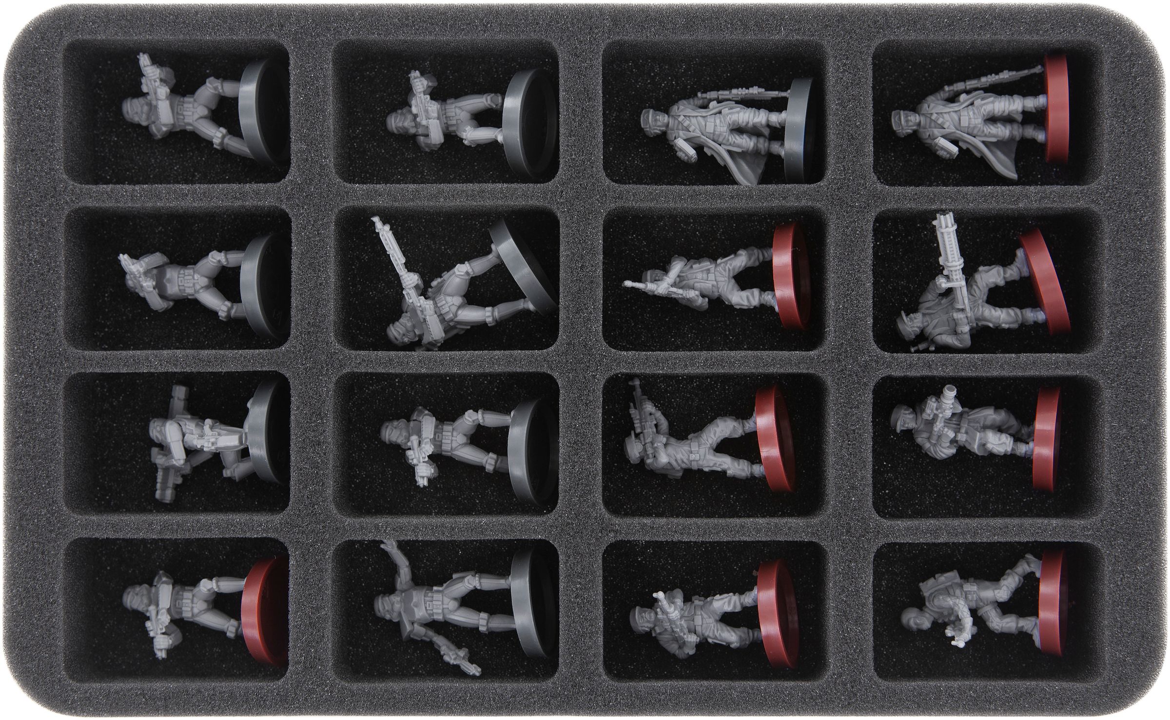 This Feldherr foam tray has 16 same-sized compartments for the clear and safe storage of wargaming miniatures in scale 1:56 (28 mm). The tray is thus ideally suited for miniatures of e. g. the games "Infinity The Game", "Warpath" or “Bolt Action".