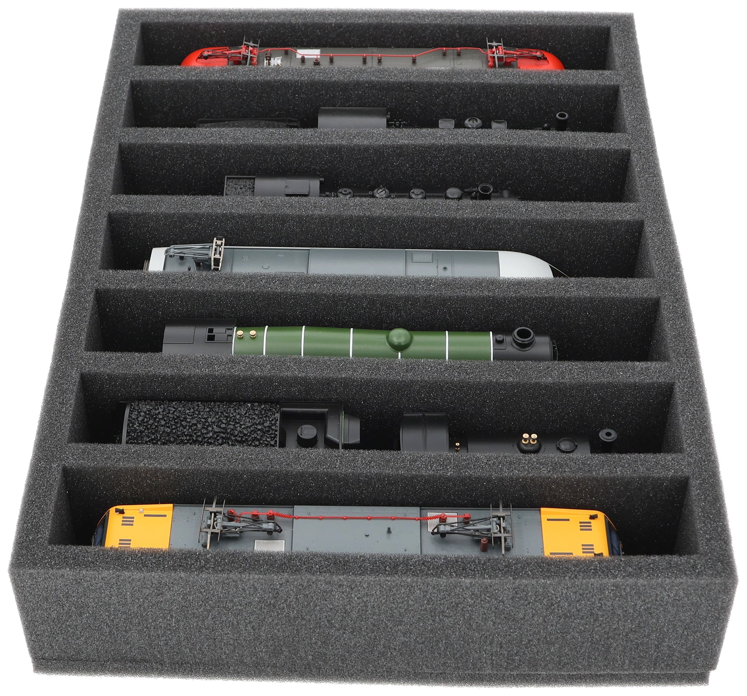 Whether for transport to exhibitions, module meetings, or safe storage on shelves at home, this insert keeps your 00 scale locomotives and cars reliably protected. The 7 compartments hold the models upright and shield them from bumps and scratches.