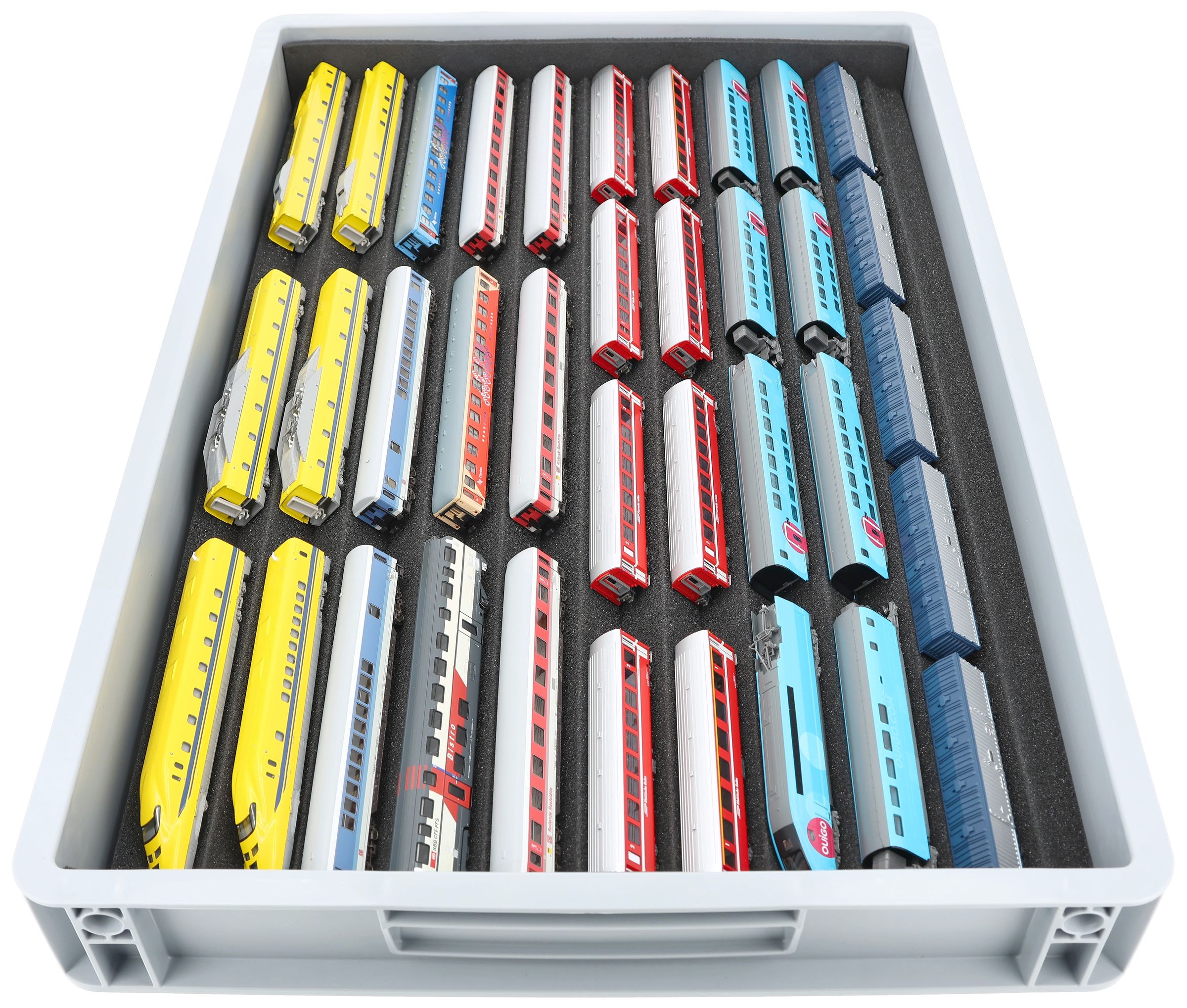 Several trains and carriages can be stored next to each other in one compartment. The set also contains the matching foam spacers to prevent them from colliding or accidental coupling. Additional spacers are available separately (HS025A002).