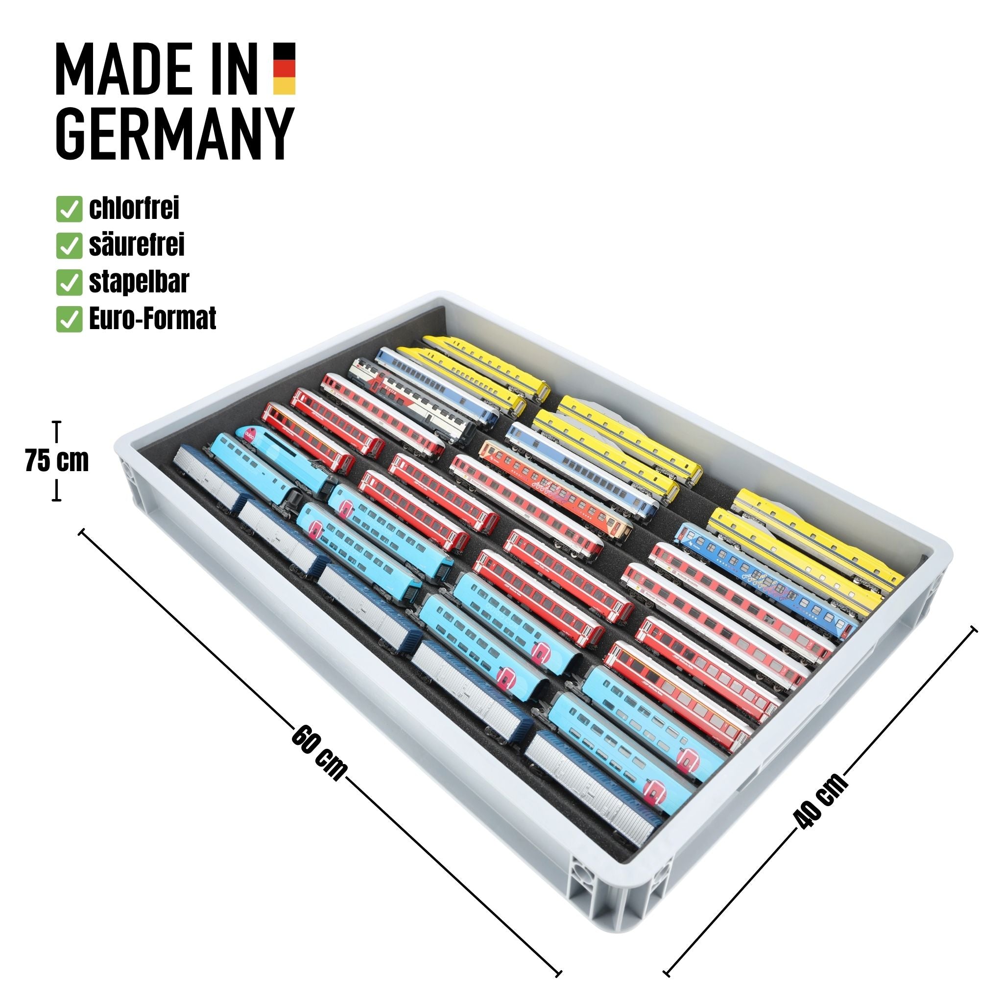 Stored neatly, presented clearly and transported safely - The reasonable, space-saving stacking box solution with the all-round foam inlay for model railroads in N gauge in the solid Eurobox. With the transport trolley, it‘s the ideal support for modular railroaders' meetings.