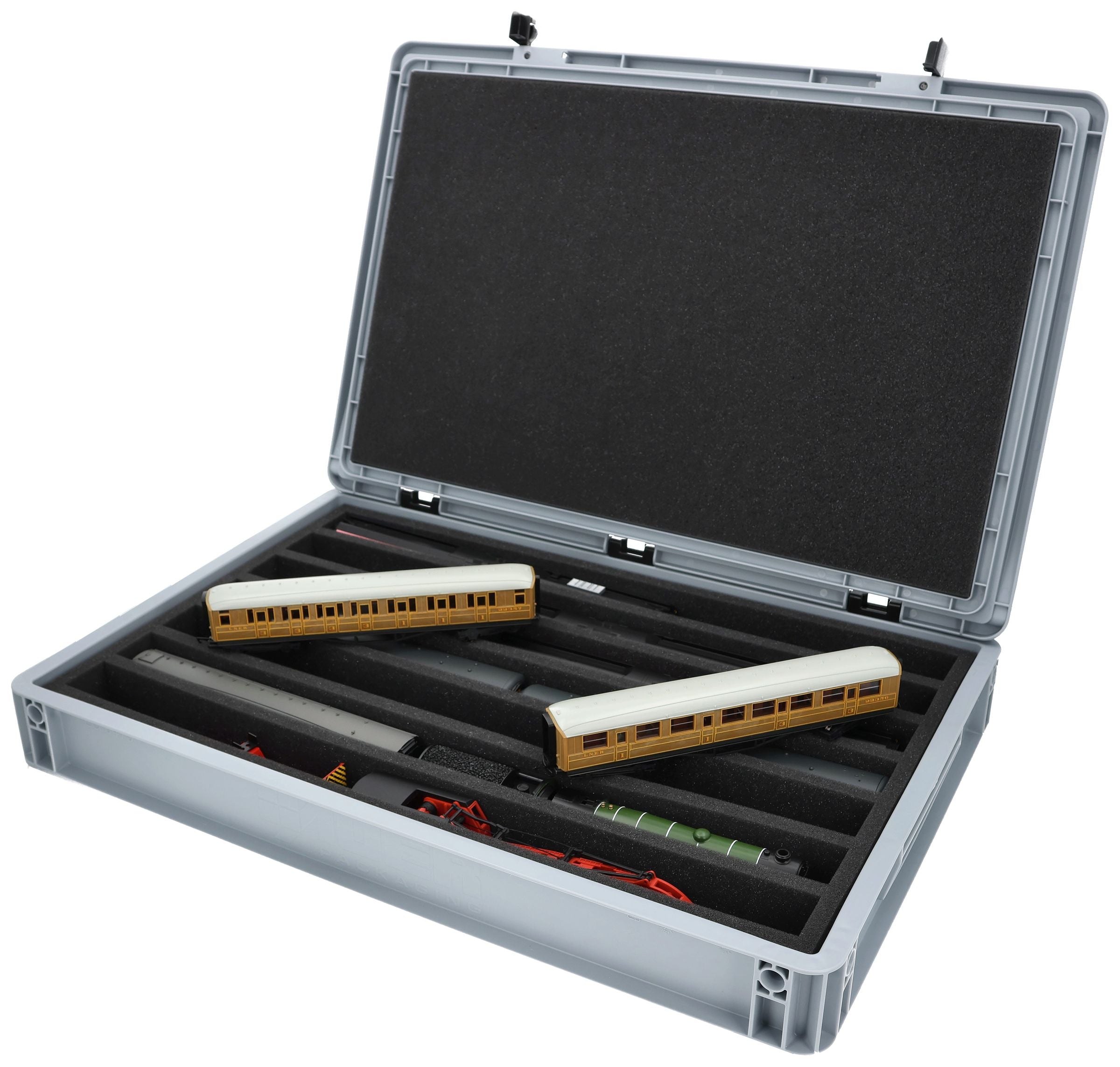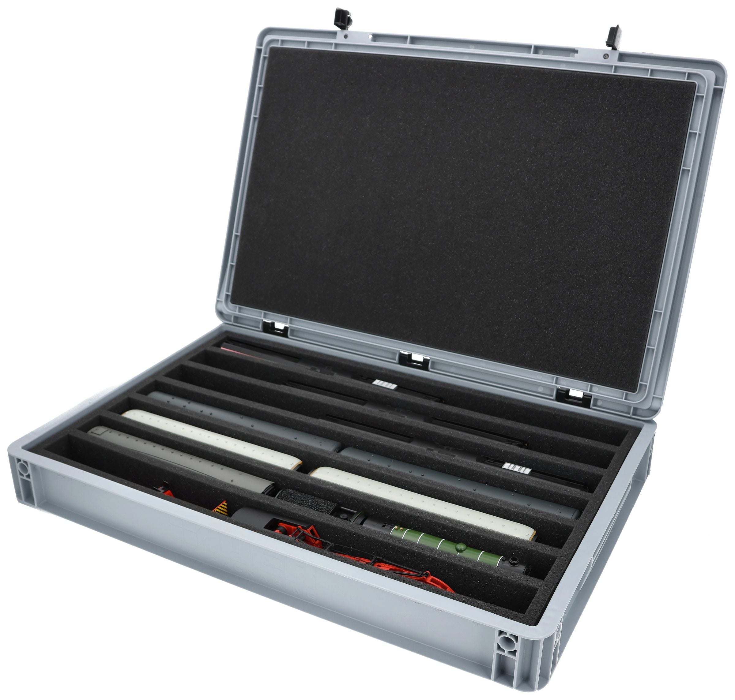The 7 equal-sized compartments (each approx. 536 x 38 x 55 mm) are specially designed for 00 scale models. Depending on their length, several wagons or locomotives can be placed side by side. The exact fit ensures that the models are securely fixed and do not slip during transport.