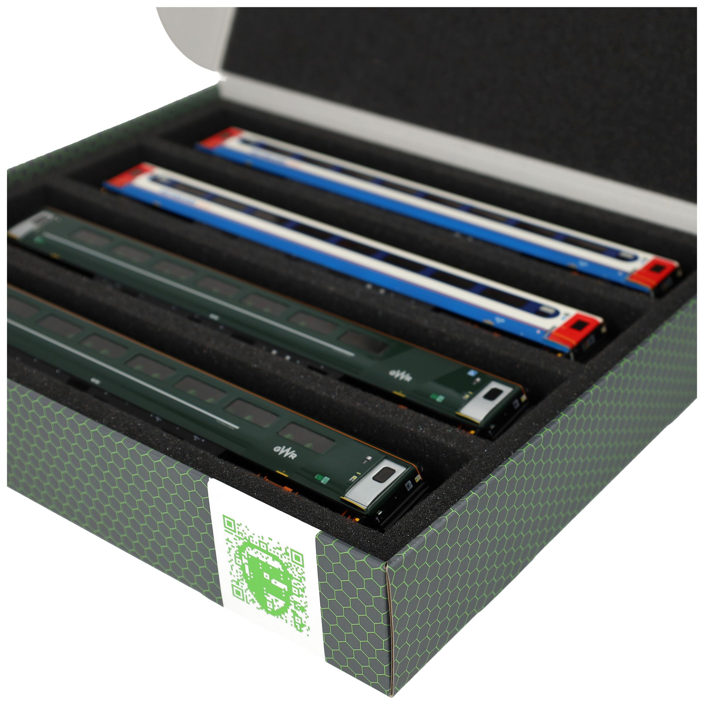 Four compartments, tailor-made for horizontal storage of model railways in Gauge 00, offer your wagons and locomotives reliable protection for storage and transport. Due to the lying position the trays can also be used as a display for the presentation of your model train collection.