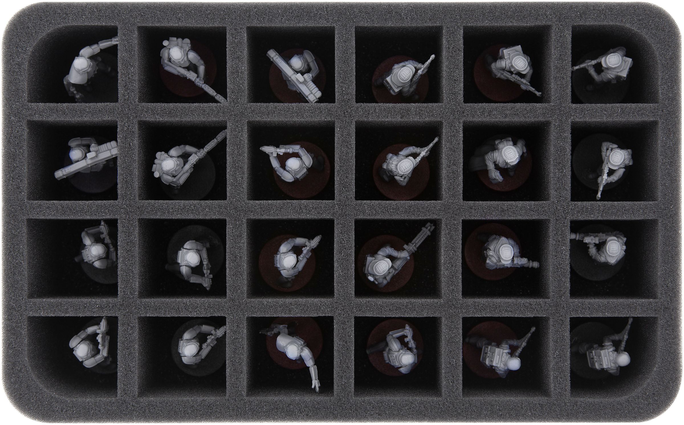 Our half-size tray accommodates 24 troop compartments, four of compartments have corners with rounded edges. This is not only a Feldherr tradition, but also ensures that the tray fits perfectly in our Mini and Mini Plus. Also ideal for placing soldiers with blasters or flame throwers.