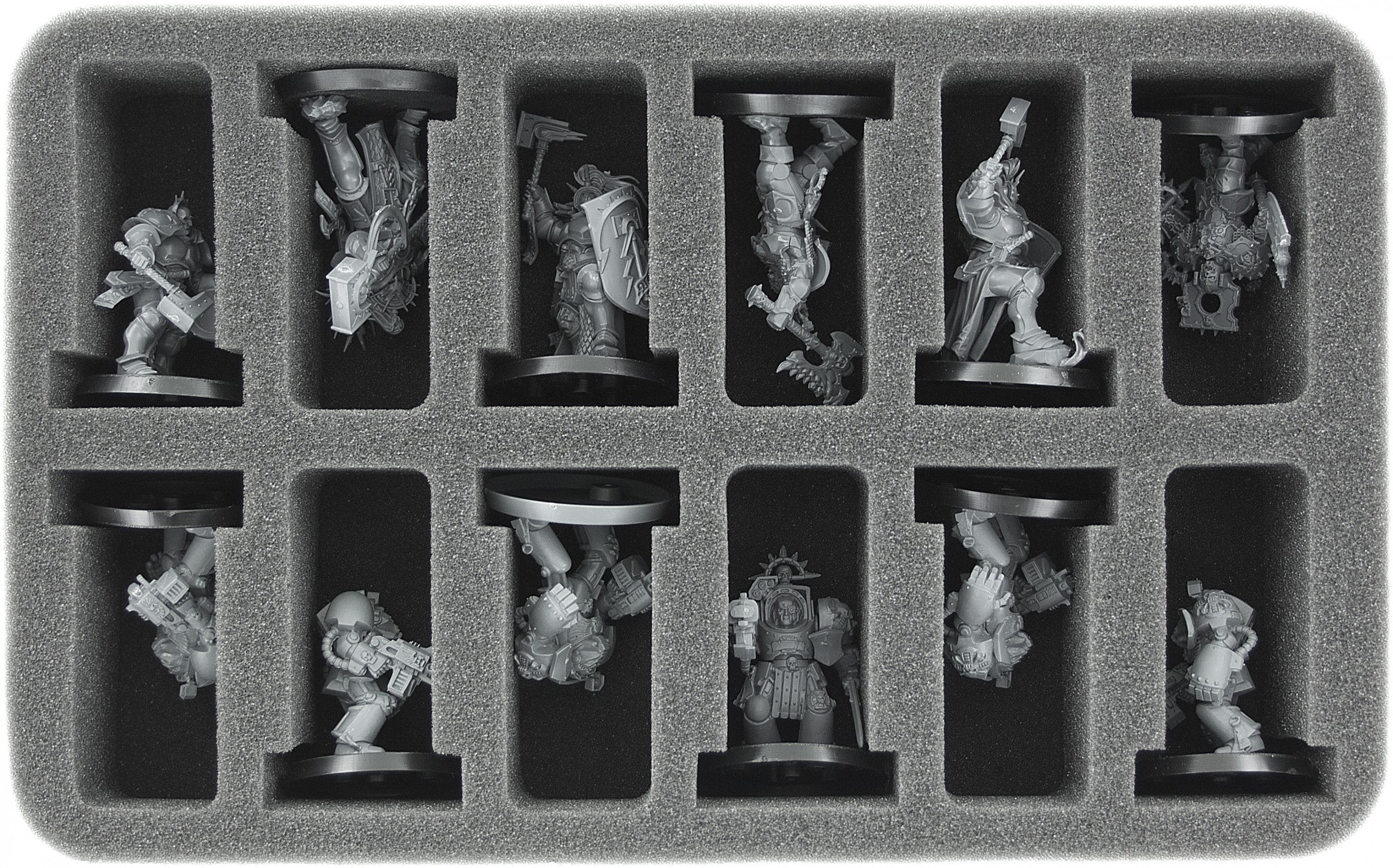 Box with foam tray for 12 GamesWorkshop miniatures on 40 mm base.