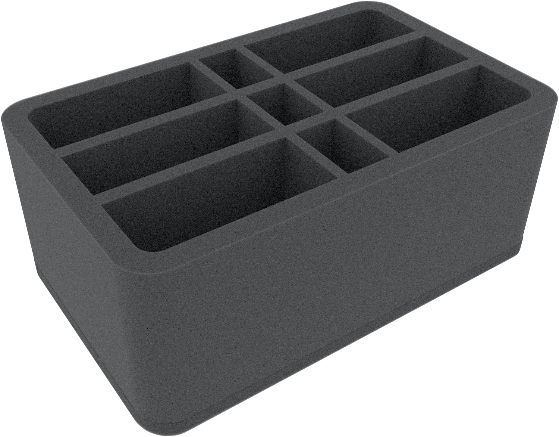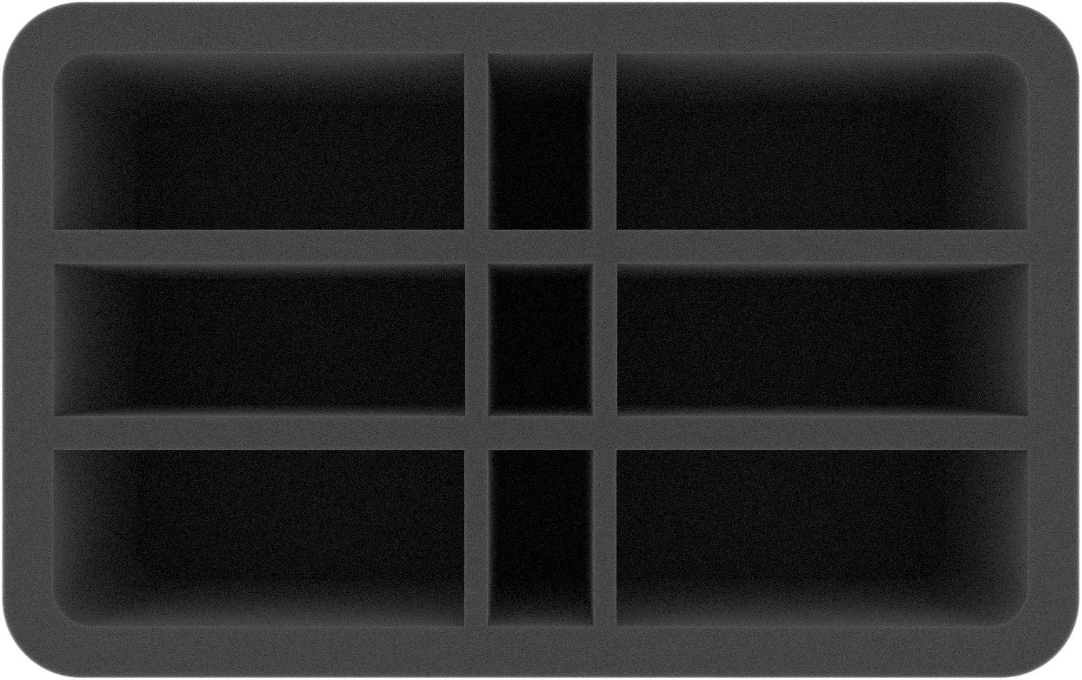 This Half-Size foam tray is divided into 9 compartments with 3 different sizes. It is particularly suitable for elongated tabletop and board game miniatures with bases up to 40 mm.