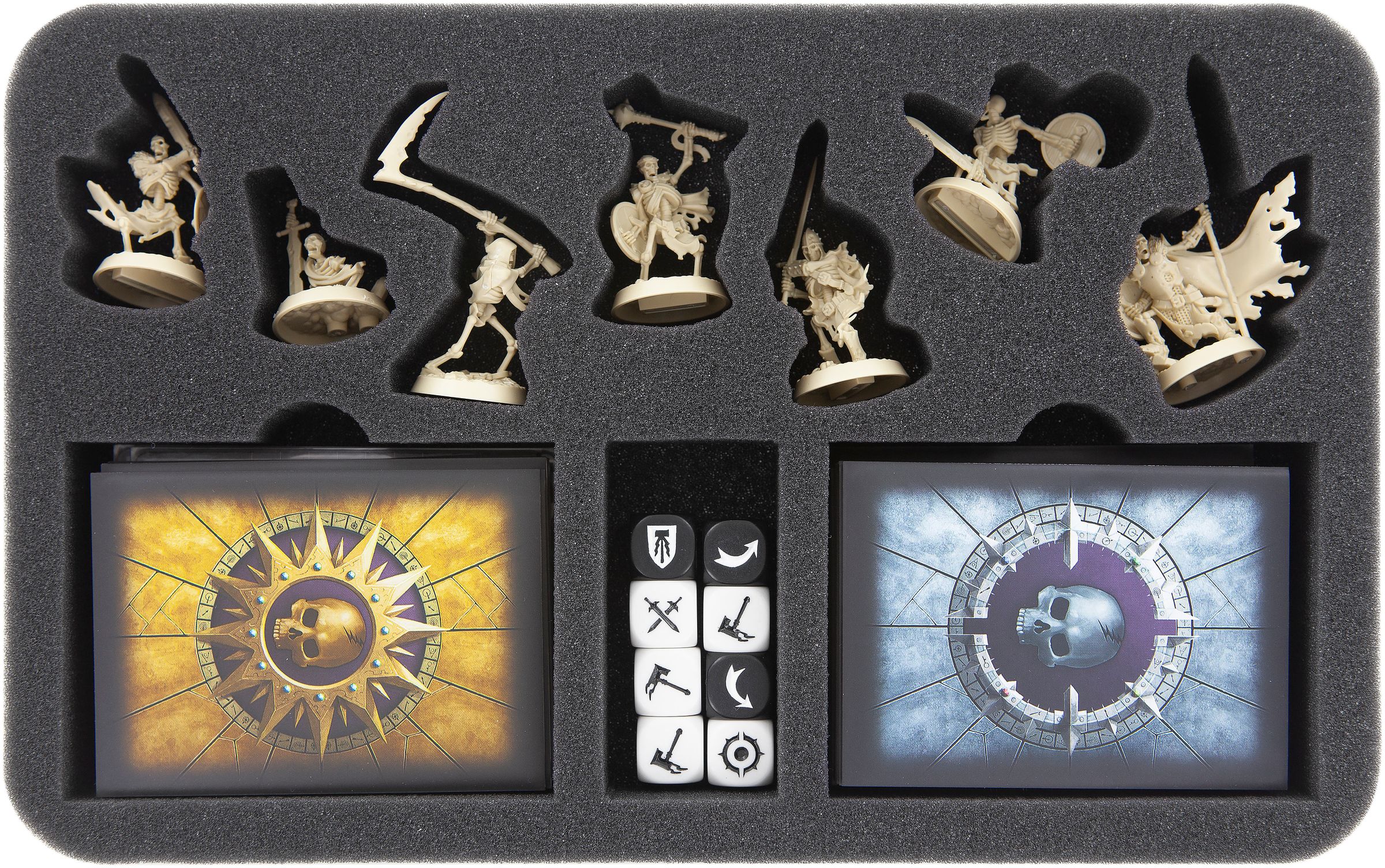 The foam tray contains seven individually tailored compartments for the 3 Petitioners, The Champion, The Harvester, The Prince of Dust and The Sepulchral Warden. The miniature-precise cutting prevents the figures from slipping or colliding. This preserves the painted figures from flaking off. This also prevents sensitive parts, such as scythes or cloaks, from bending or breakage.