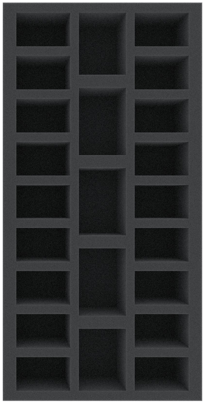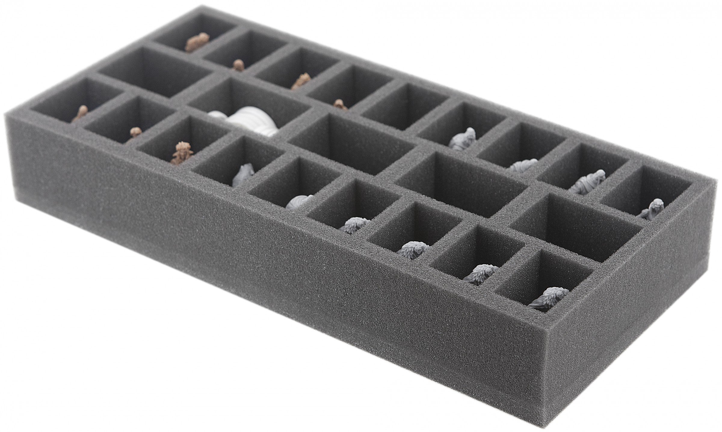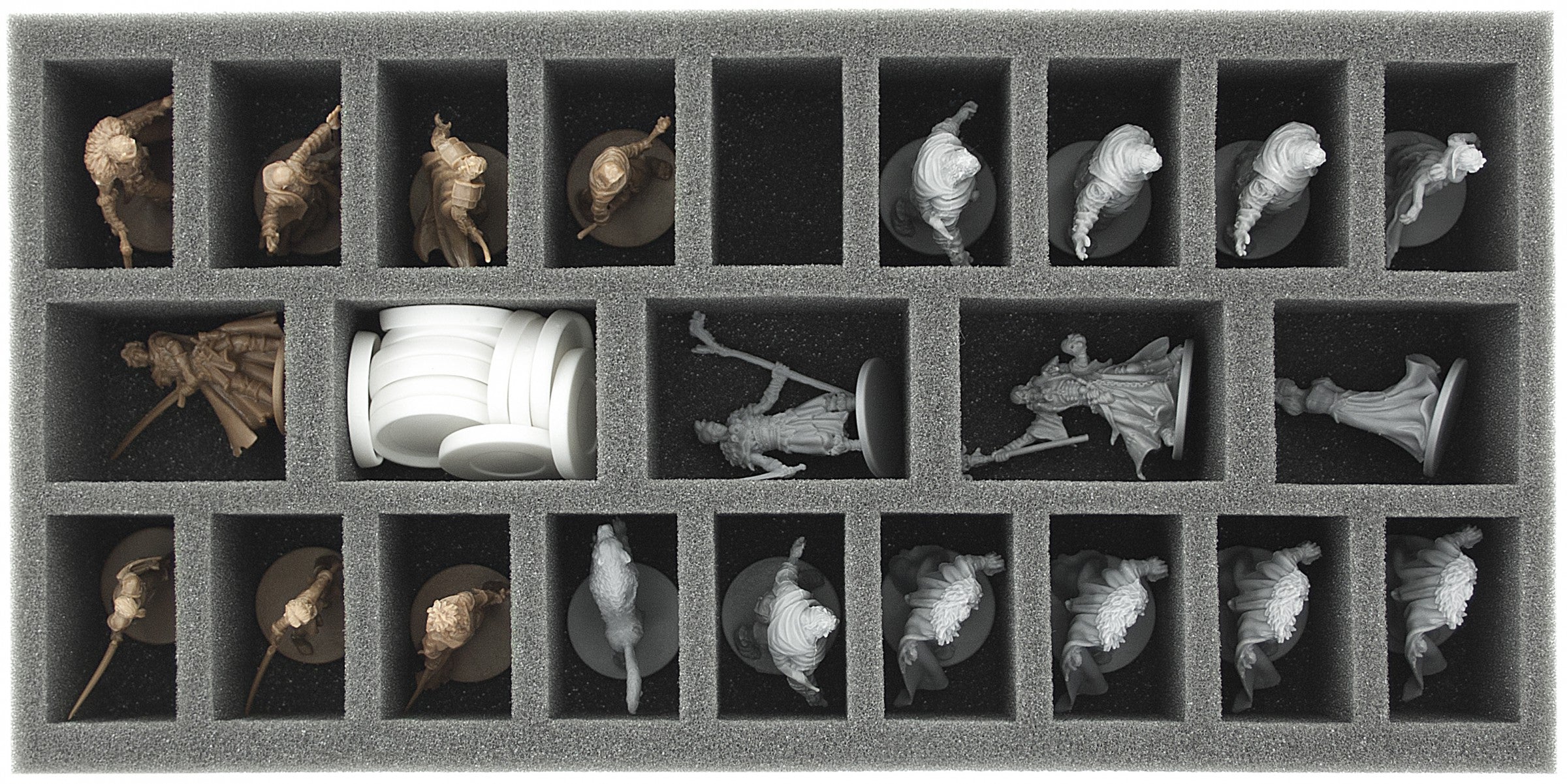 Foam tray for Zombicide Zombies and Survivors. The 23 different sized compartments are god for walkers, runners fatties, necromancer, wolfz and survivors. The foam tray occupies half the ground space of the board game box. In addition, we recommend to AU085ZC20 and AU035ZC22.