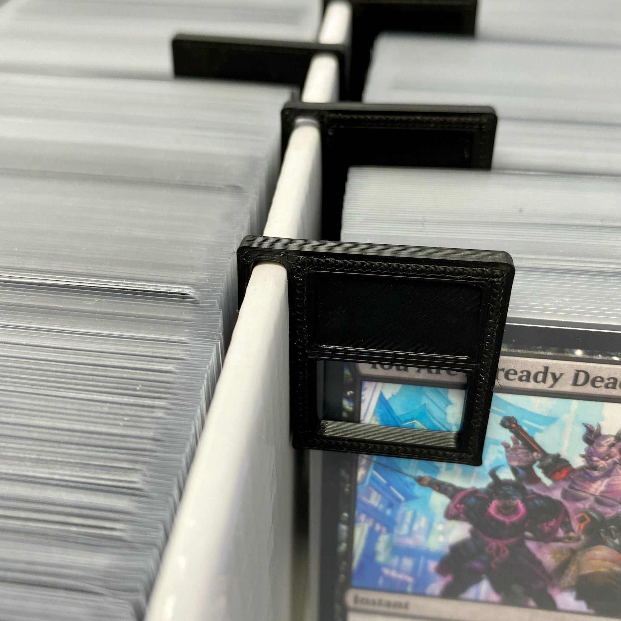 The Divider Clip simply hooks into the center partition wall of the card deck box, serving as a flexible card divider for separating your playing and trading cards.