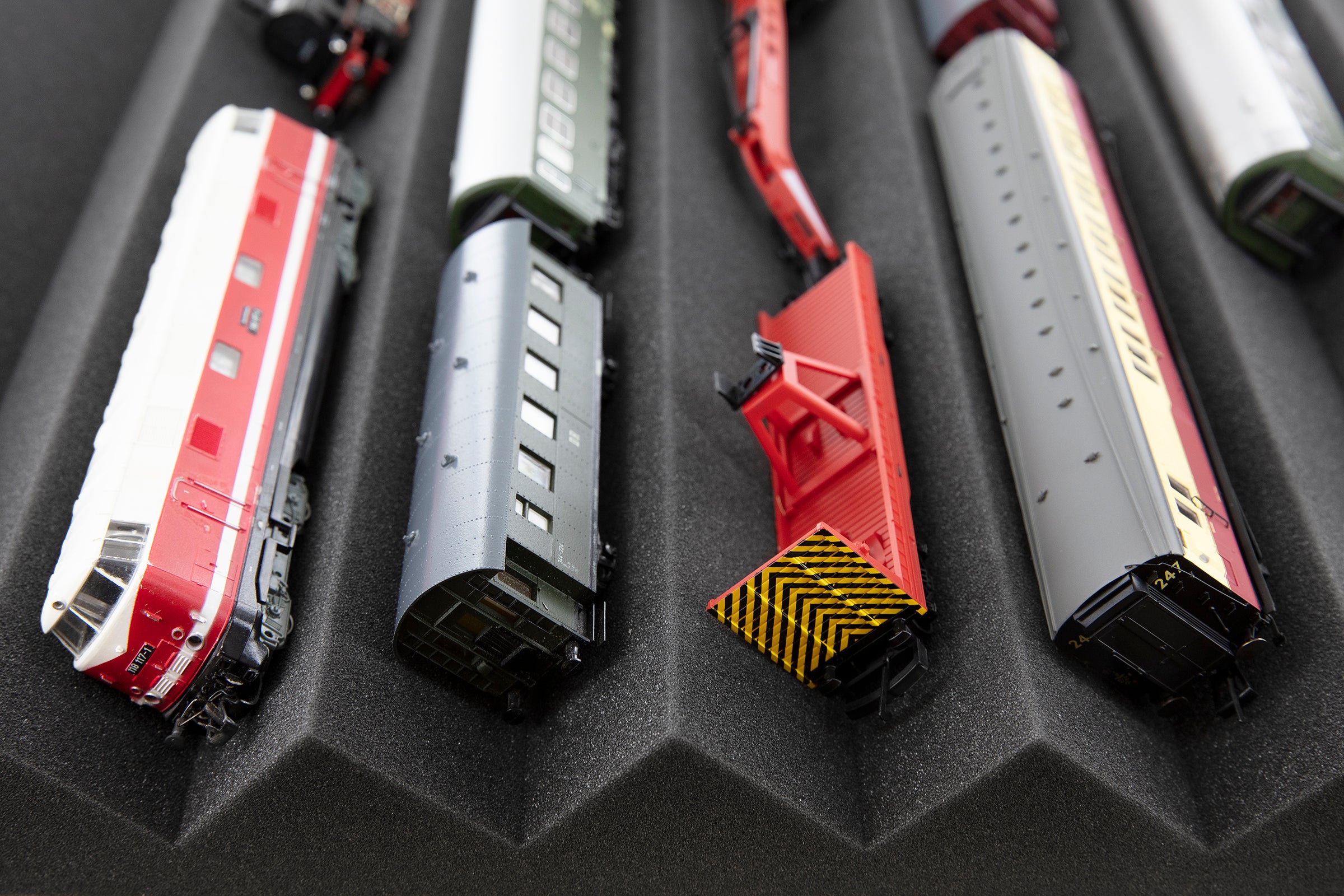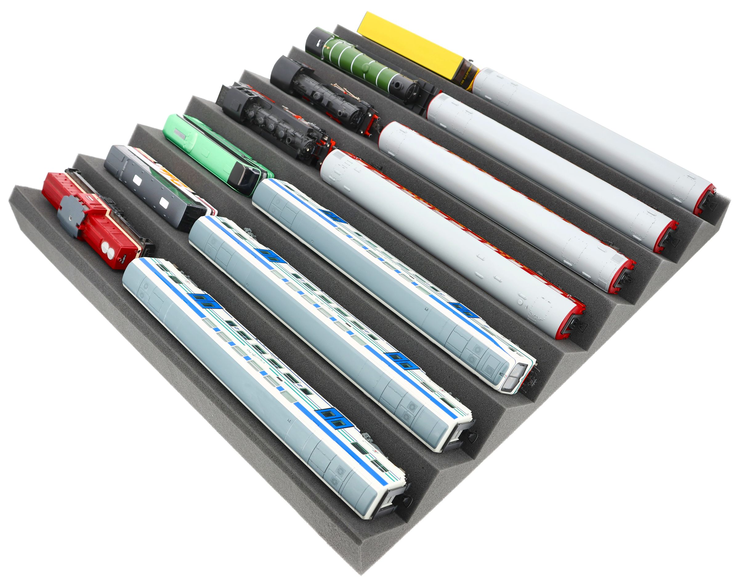Customizable zig-zag foam mat for safe and tidy storage of model railways in H0 gauge and 00 gauge - always the right size.