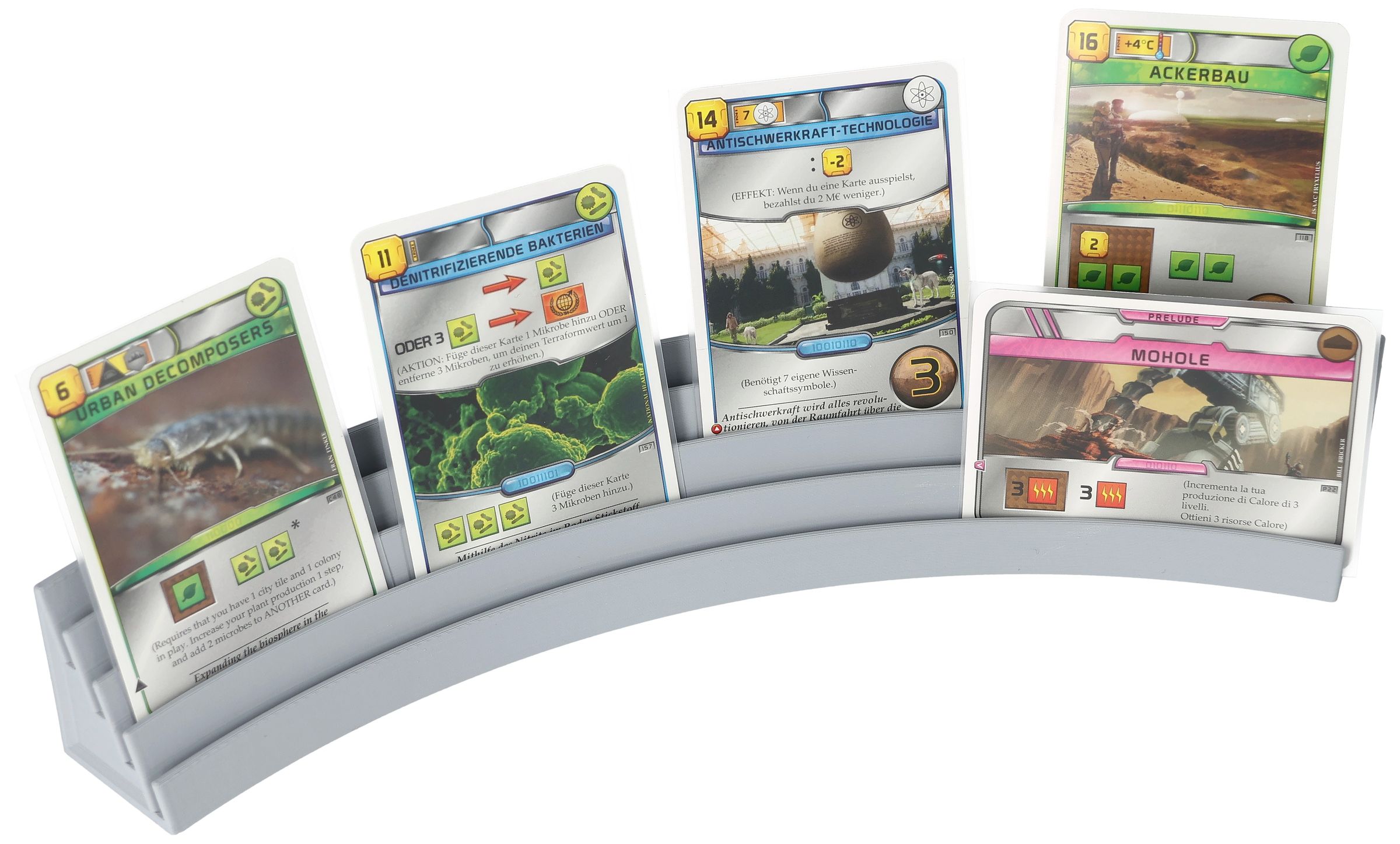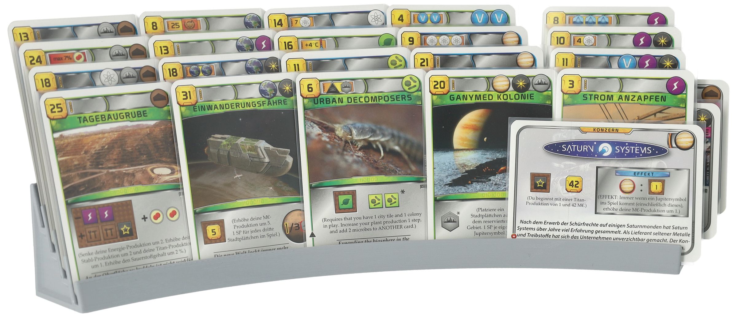 - Each holder provides space for up to 20 cards: four slots provide enough space to place your cards in hand (corporation and project cards) in front of you in an orderly fashion