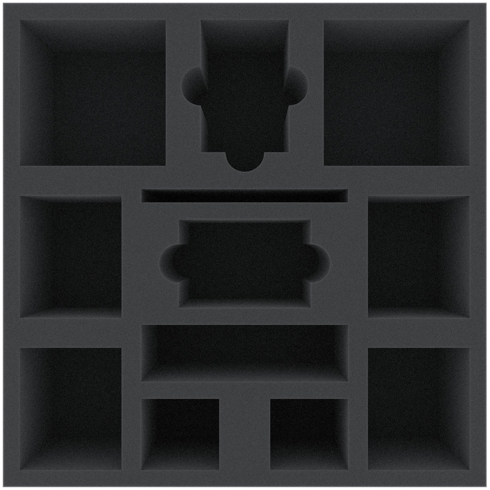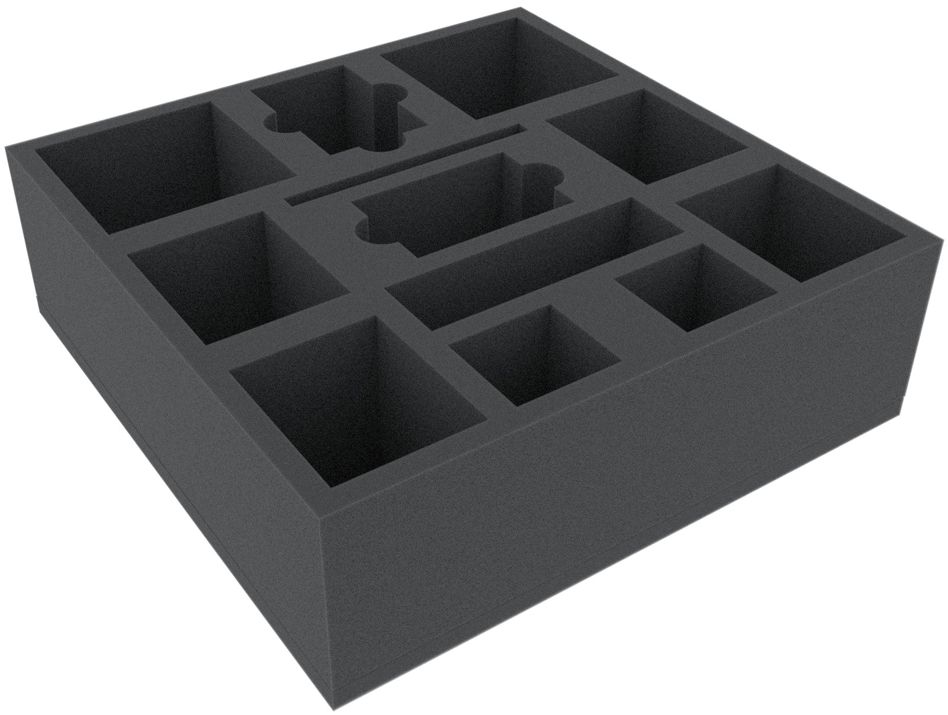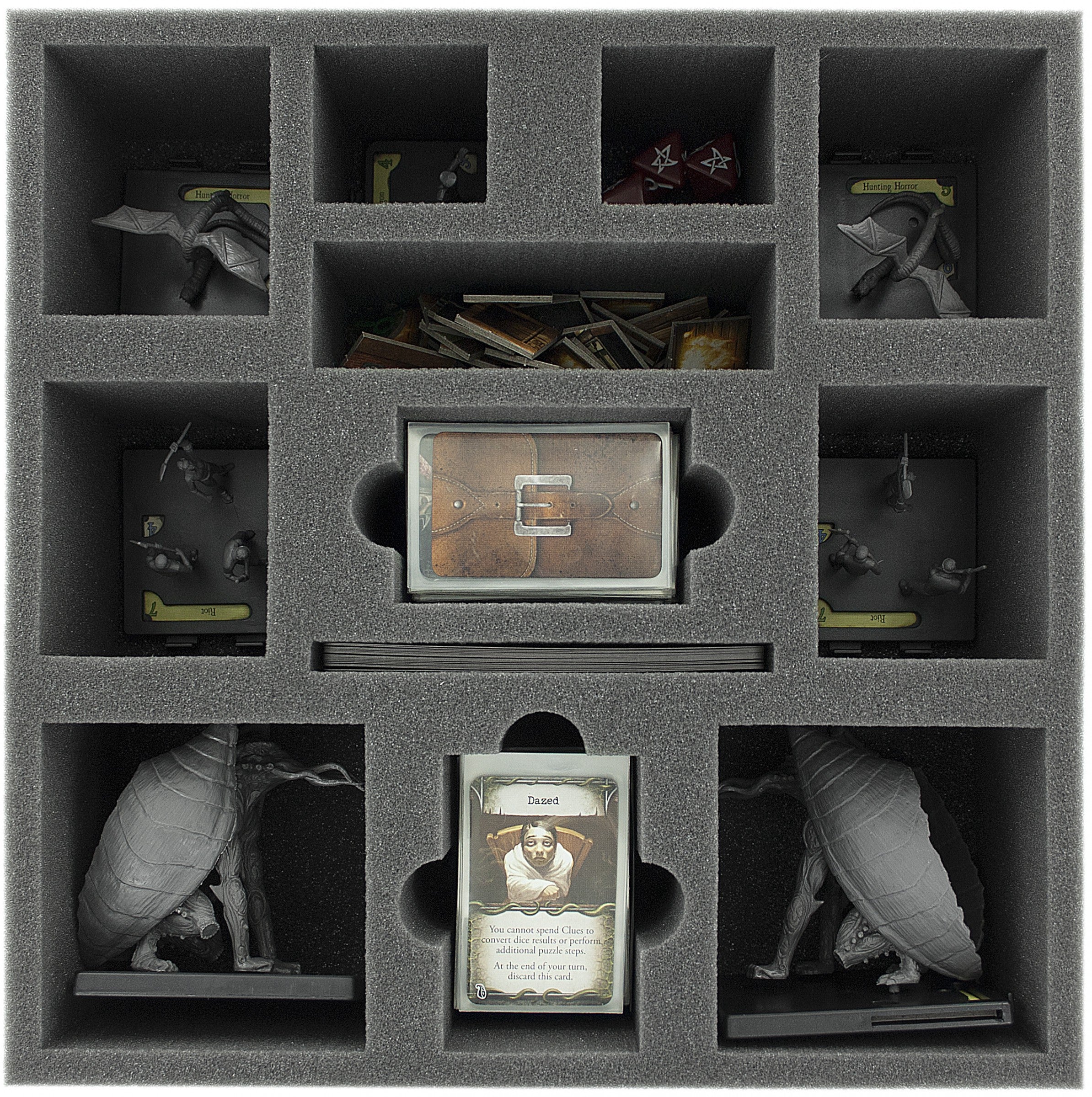 Foam tray especially for Mansions of Madness - 2nd Edition. The 12 different sized compartments are suitable for all conceivable game material like the huge monsters, tokens or cards in sleeves.