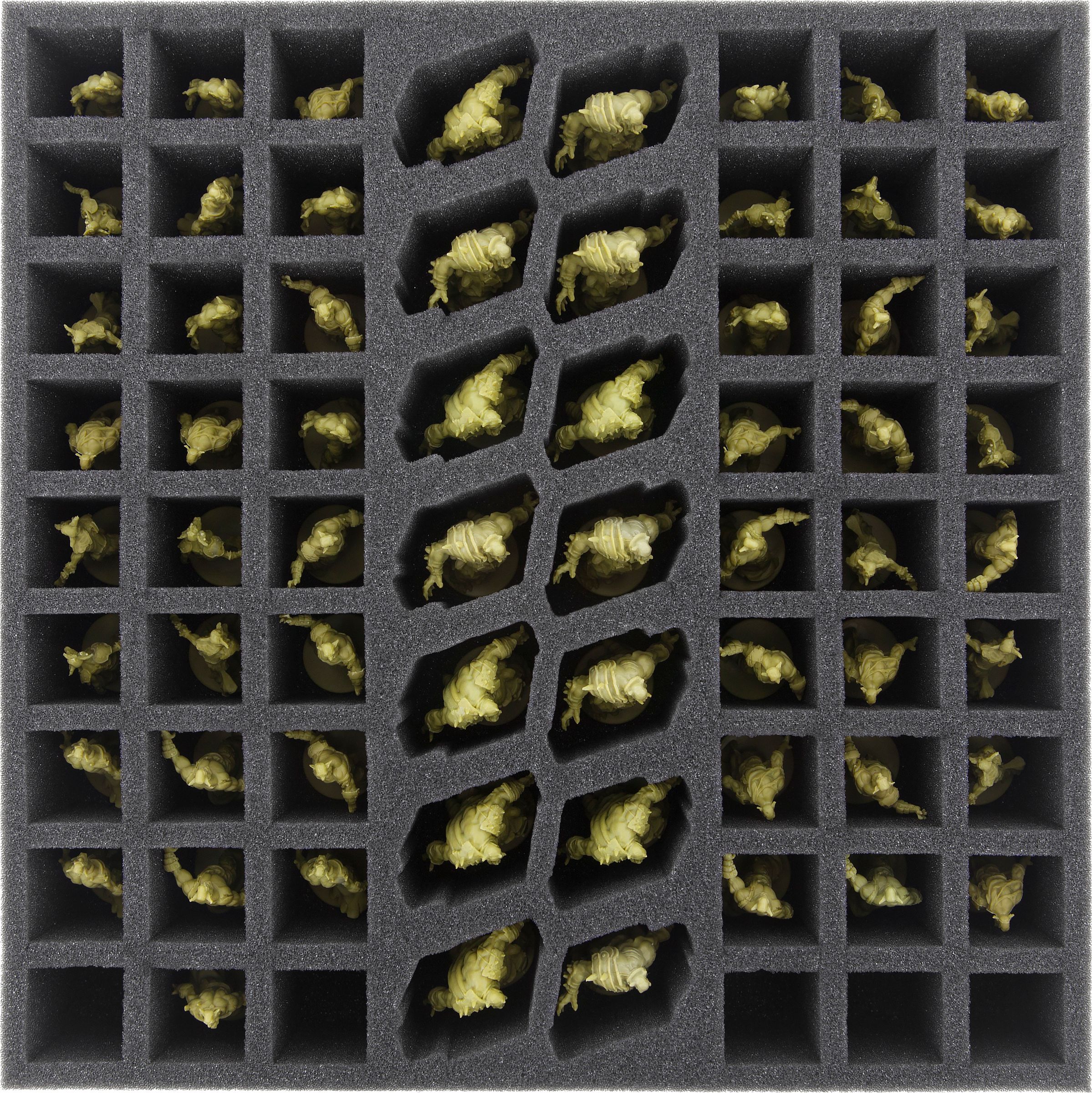 This foam tray is divided into 68 compartments of two sizes to stowe your miniatures (e.g. Orc Walkers, Fatties). It fits exactly into the original Zombicide board game boxes.