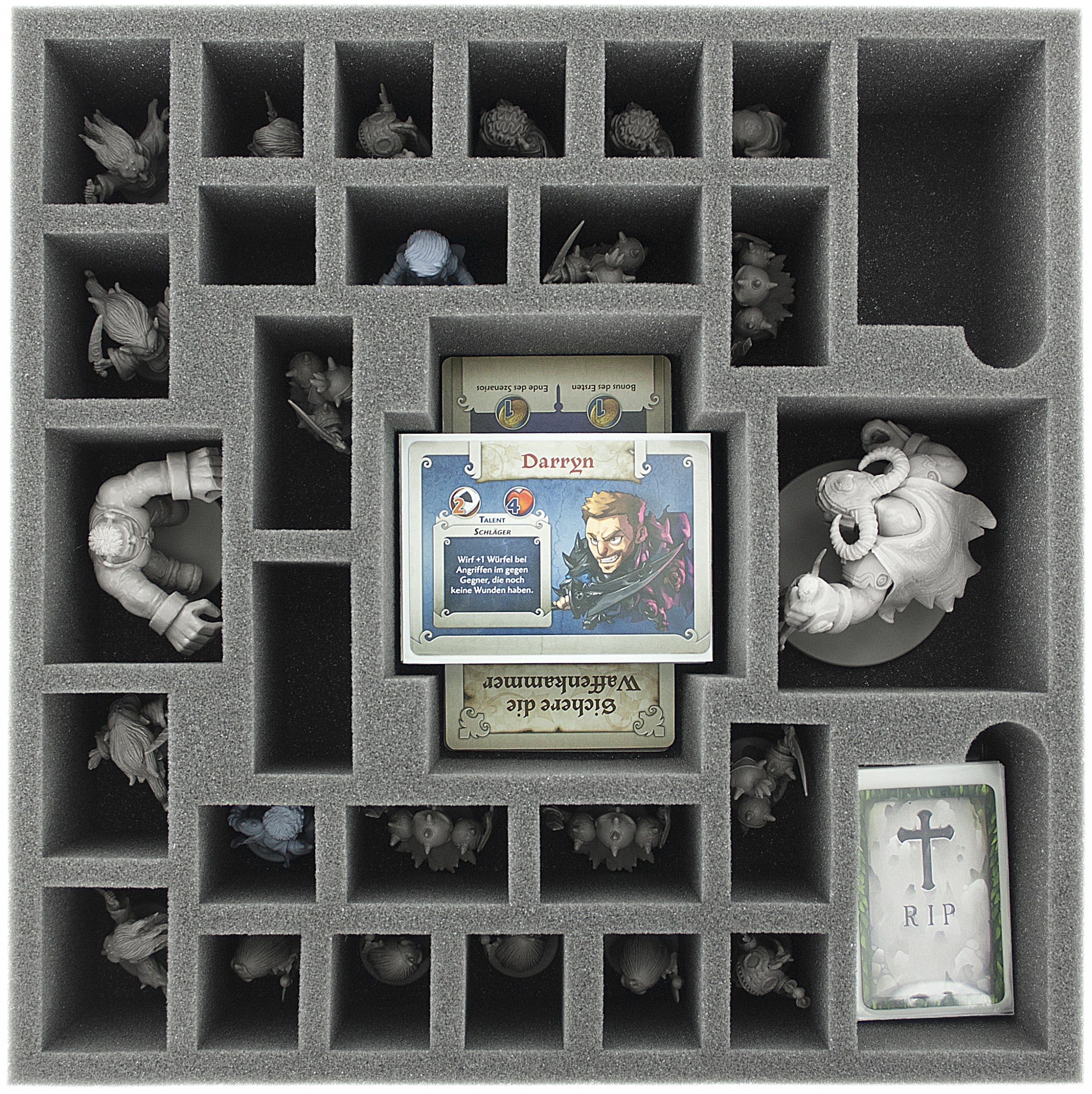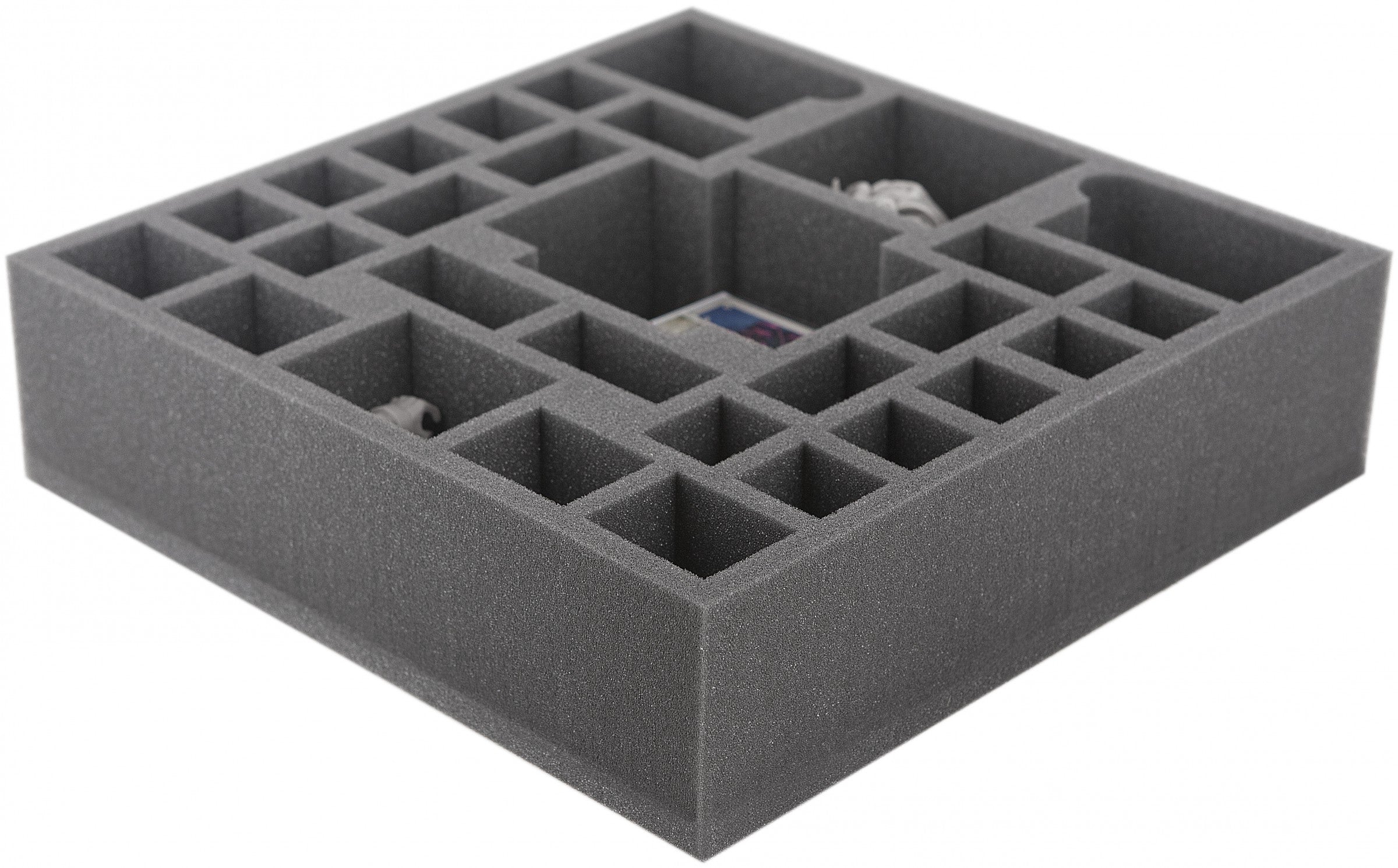 Foam tray especially for Arcadia Quest - Beyond the Grave. The 29 different sized compartments are suitable for all conceivable game material.