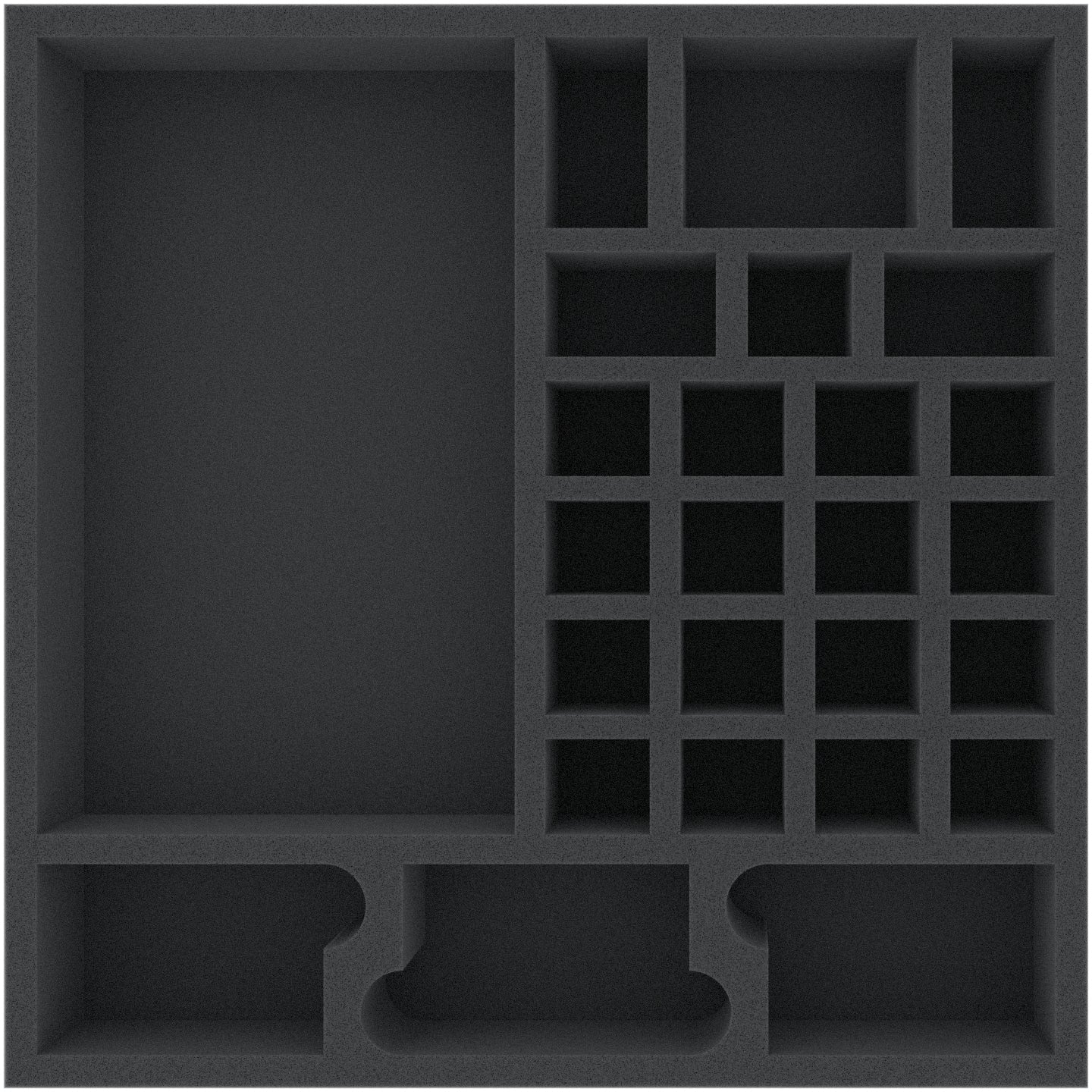 This 50 mm high foam tray is divided into 26 compartments. It is particularly suitable for the safe storage of tabletop and board game miniatures, as well as other fragile models and small parts.