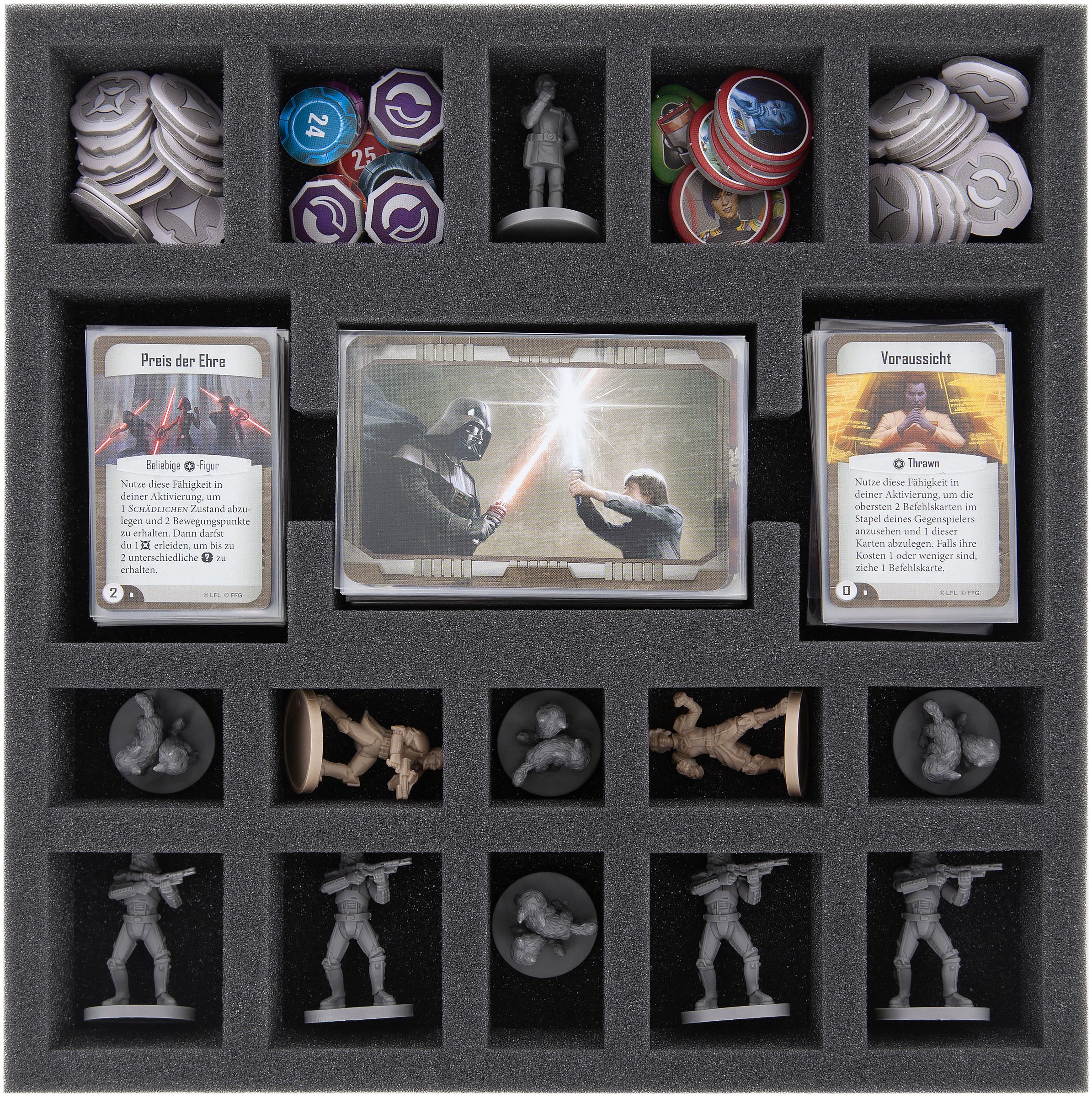 In order for you to be able to provide your new minis a home, we created a new foam tray. The tray features 18 custom cut compartments, which will hold the Heroes, Loth-cats and Death Troopers as well as ALL game accessories like (sleeved) cards and markers. In addition, one compartment will accommodate the Thrawn-miniature.