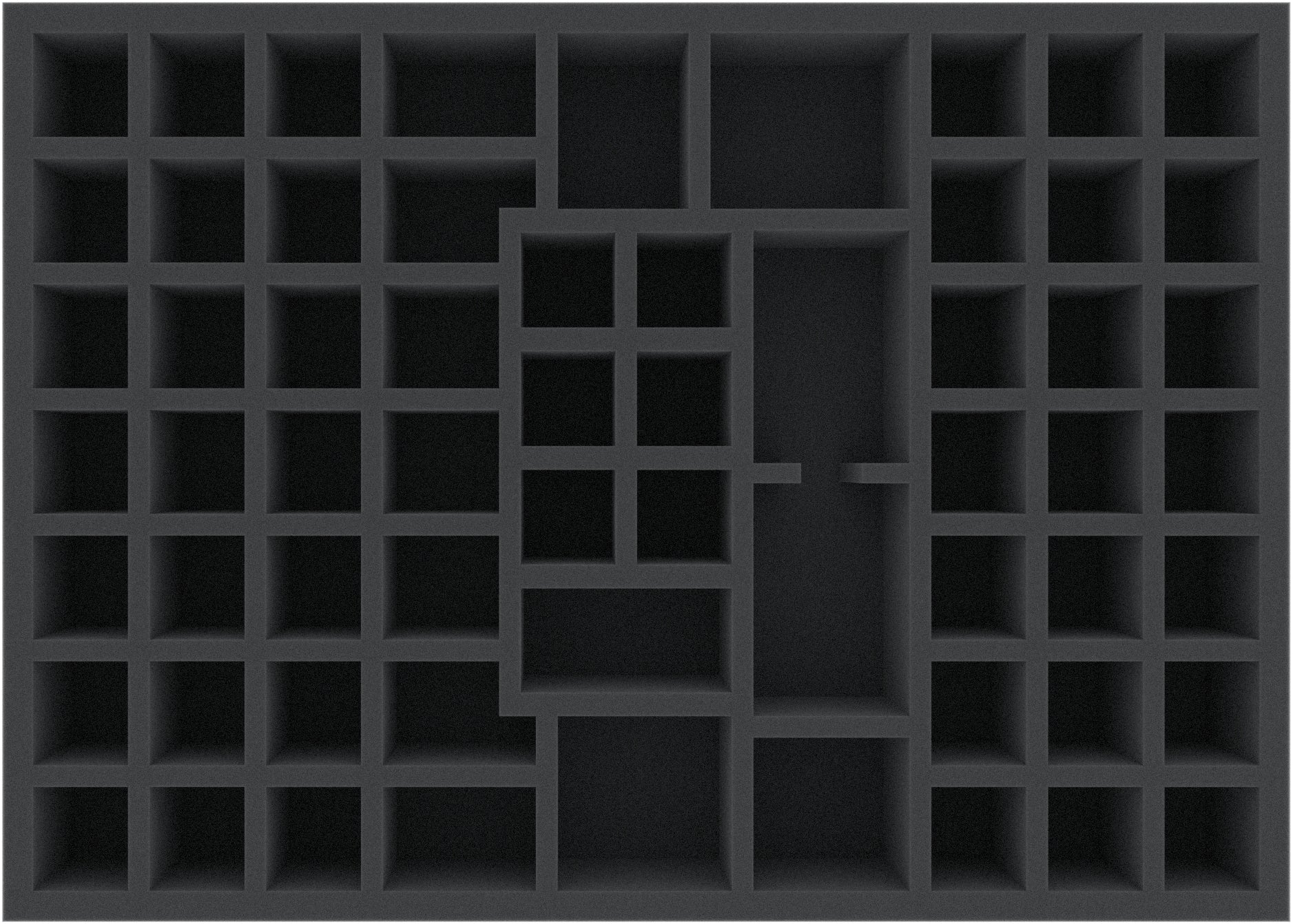 This foam tray is divided into 62 compartments of different sizes. It is particularly suitable for safe storage of miniatures and game material in board game boxes.