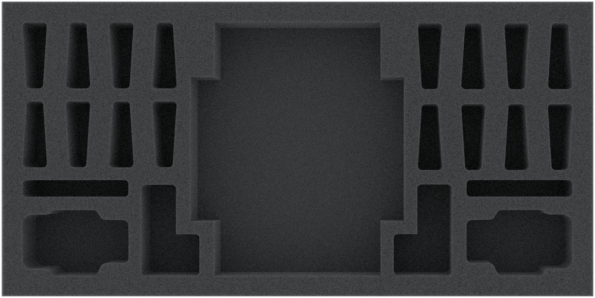 This foam tray features 23 custom cut compartments for accessories of the board game Starship Samurai. One large compartment is reserved for the (sleeved) Action-, Unit- and Location cards. 16 small compartments will hold 16 Fighter Ships, 2 compartments are custom cut for Carrier Ships and 4 additional compartments provide space for markers and tokens.