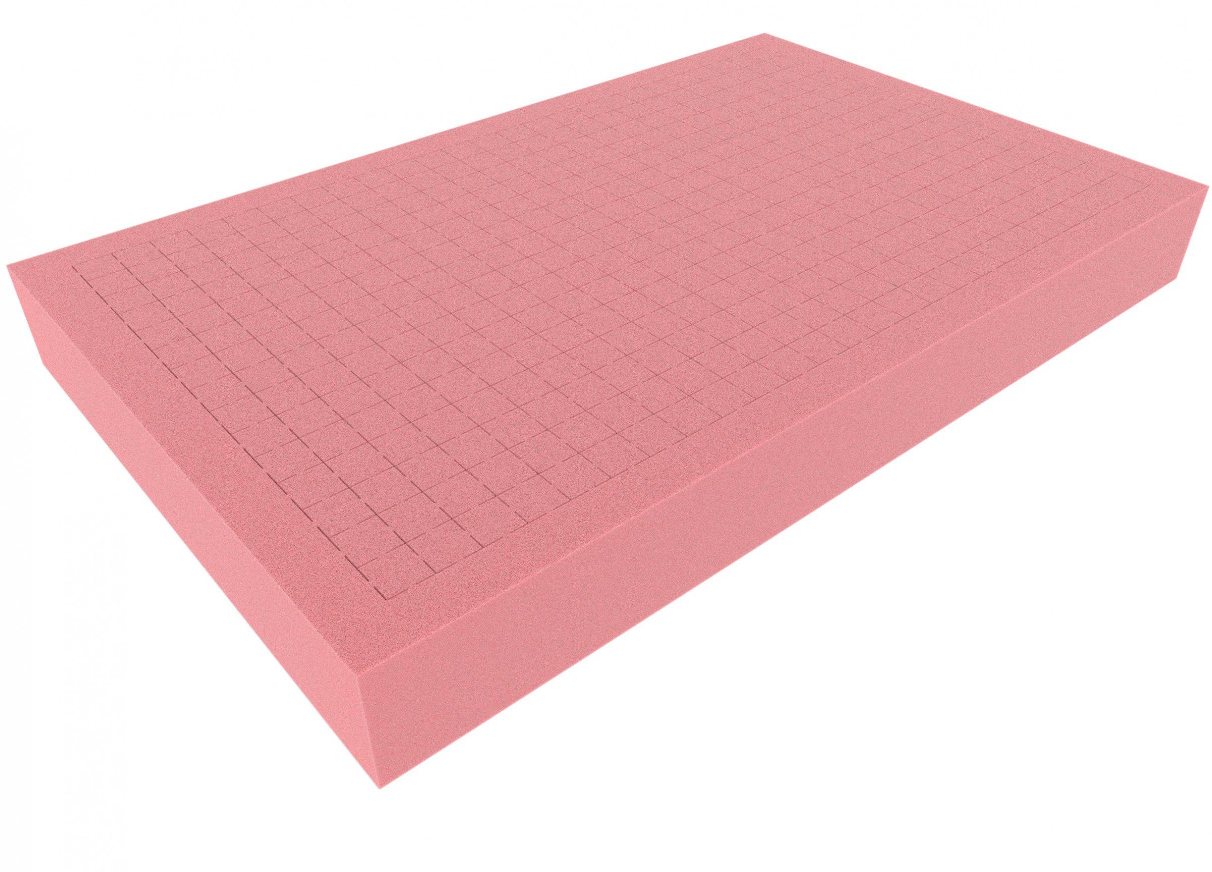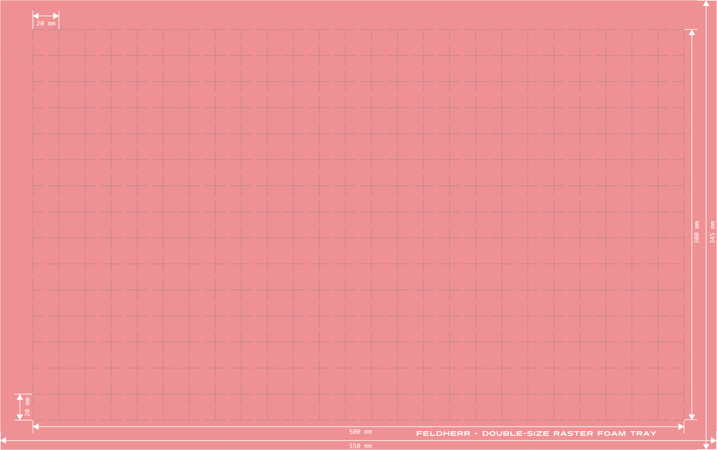 This foam is perforated with a pick and plug of 20 mm x 20 mm (25 x 15 = 375 cuboids). A circumferential border is not perforated and increases the stability of the fitted foam insert. The grid allows the tool-free adjustment of the foam inserts to your needs. The article will be delivered without base foam sheet. As a base we offer for example the articles DS010BESD or DS020BESD.
