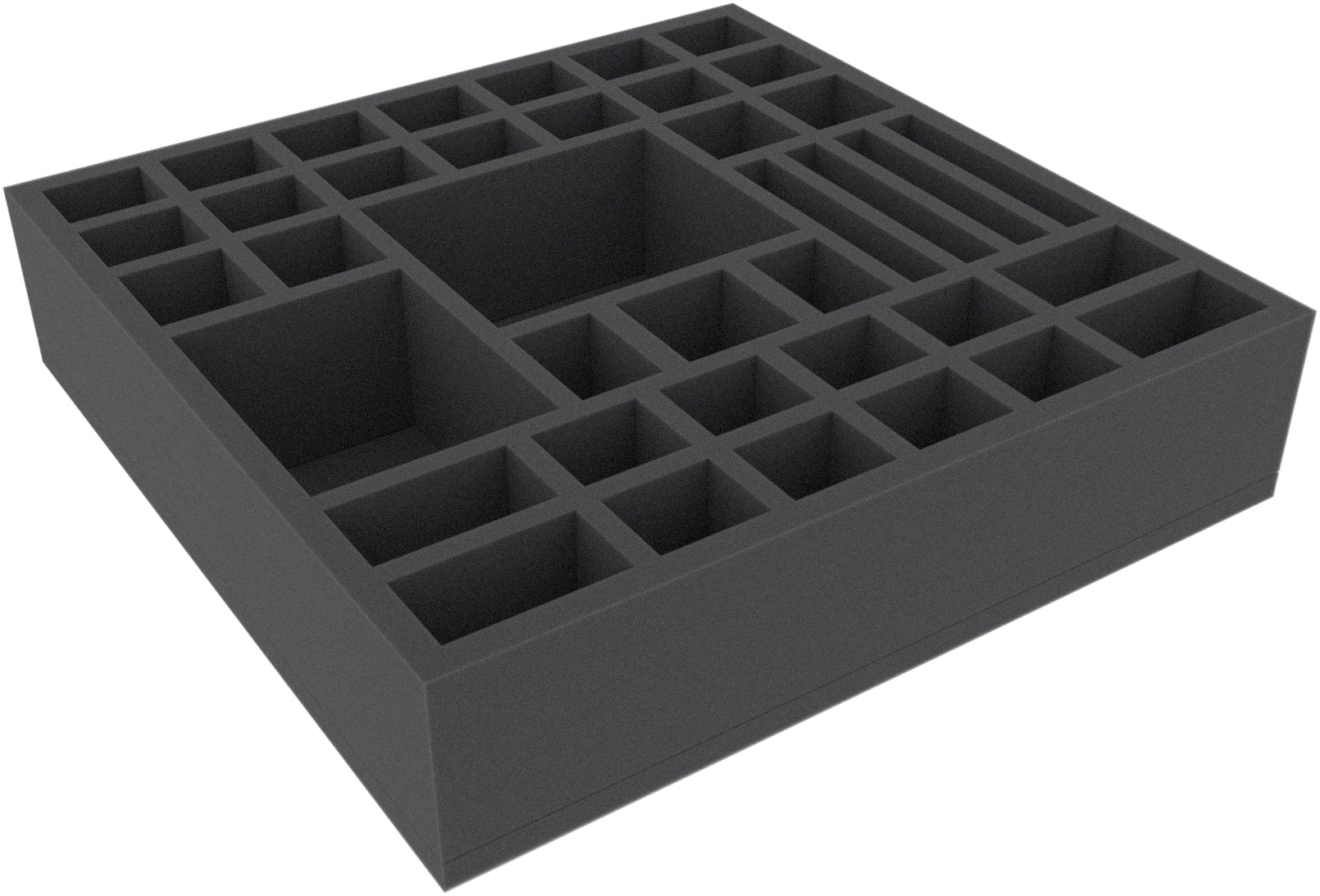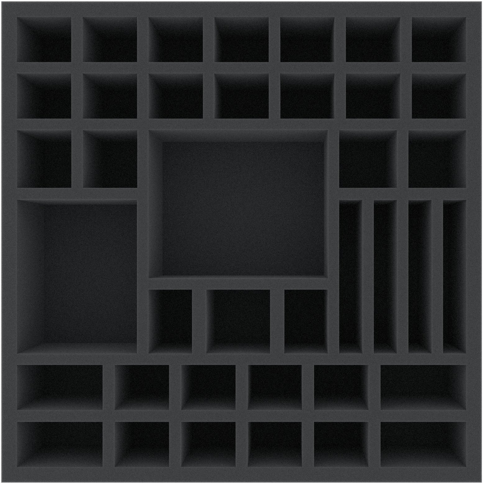 This foam tray is divided into 39 compartments of different sizes. It is particularly suitable for the safe storage of miniatures of various board games. It can also be used to sort accessories such as tokens, cards, and dice.
