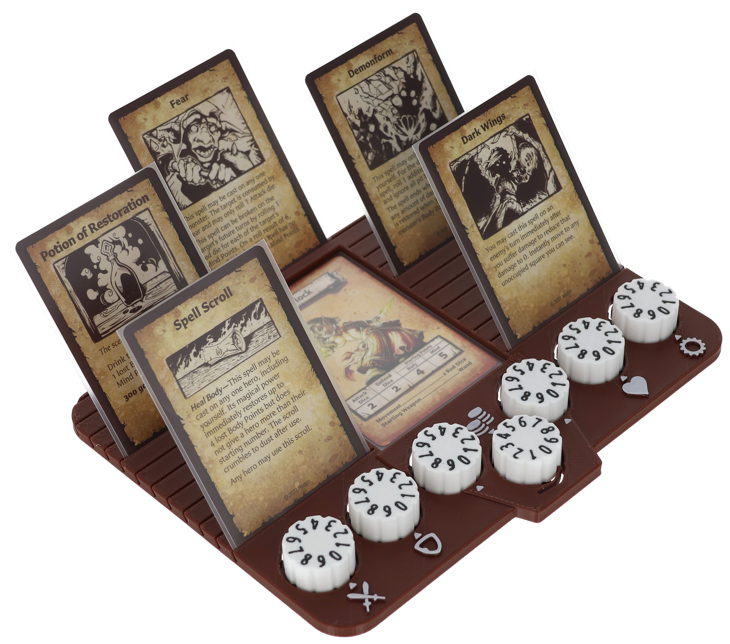 - 22 slots and a card compartment on the Dashboard accommodate up to 23 game cards like equipment cards, treasure cards, magic cards, and rule overviews.