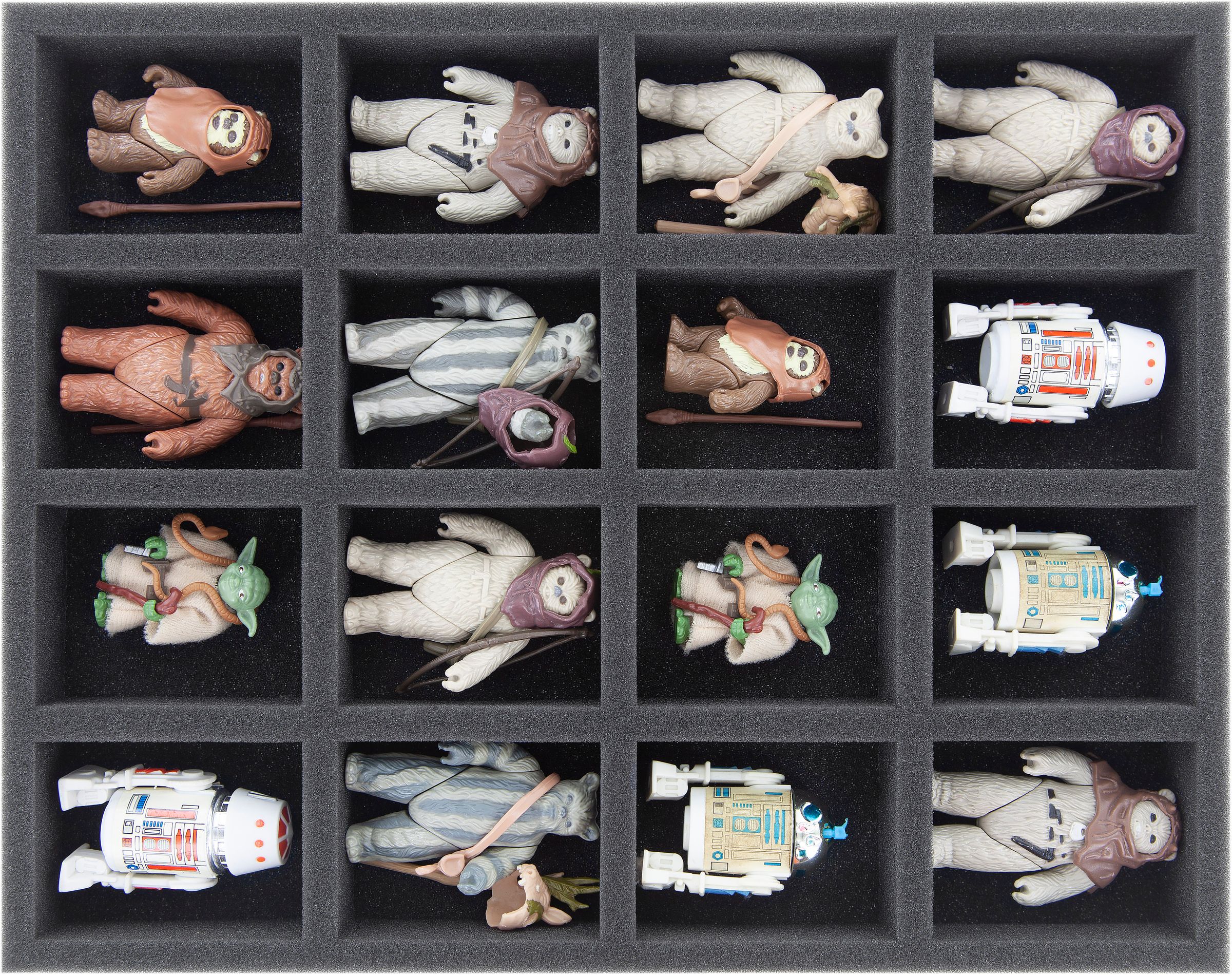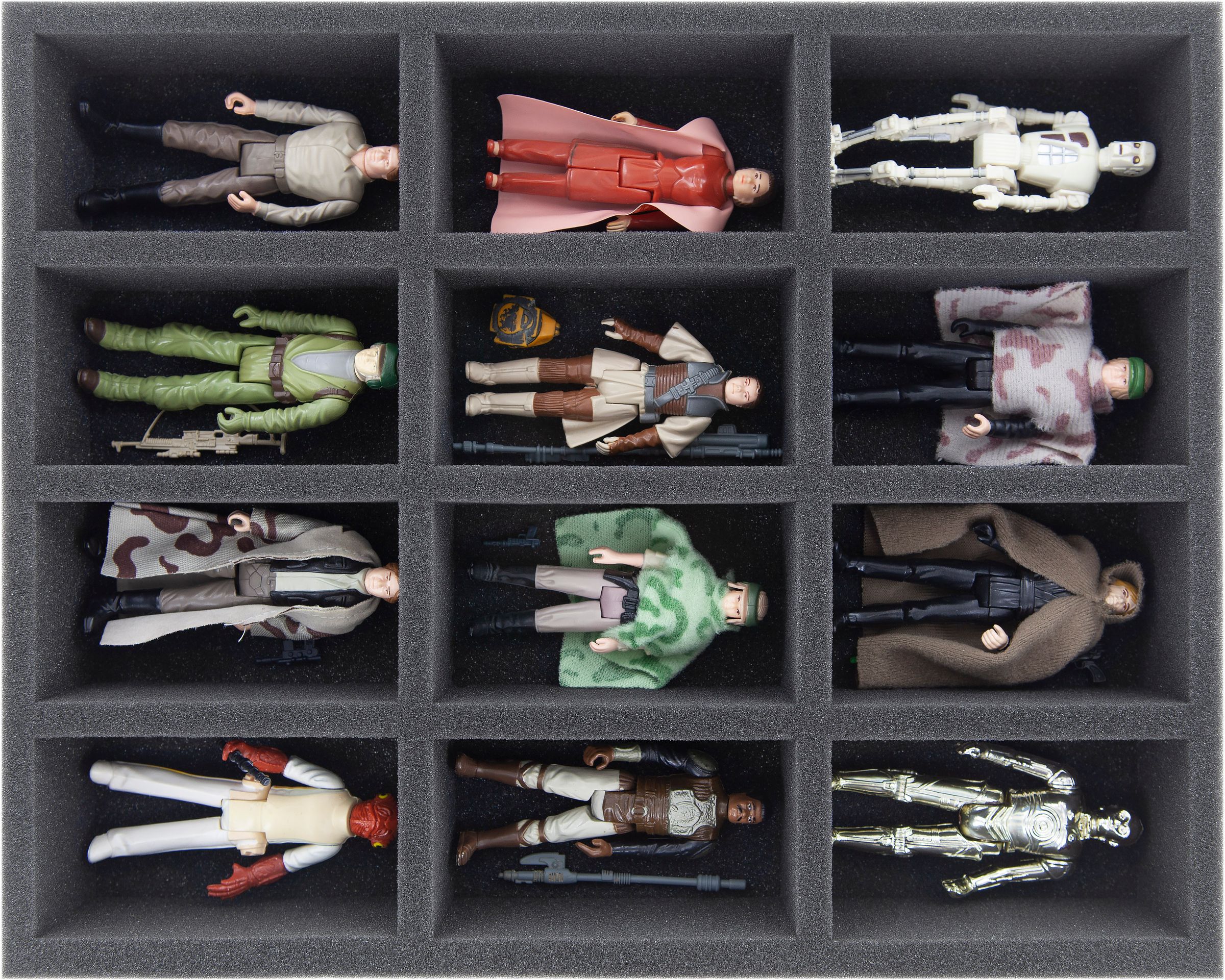 The two foam trays with the 12 compartments each are ideal for the safe storage of medium-sized miniatures (3.75 inches) like e. g. Stormtroopers or Luke Skywalker.