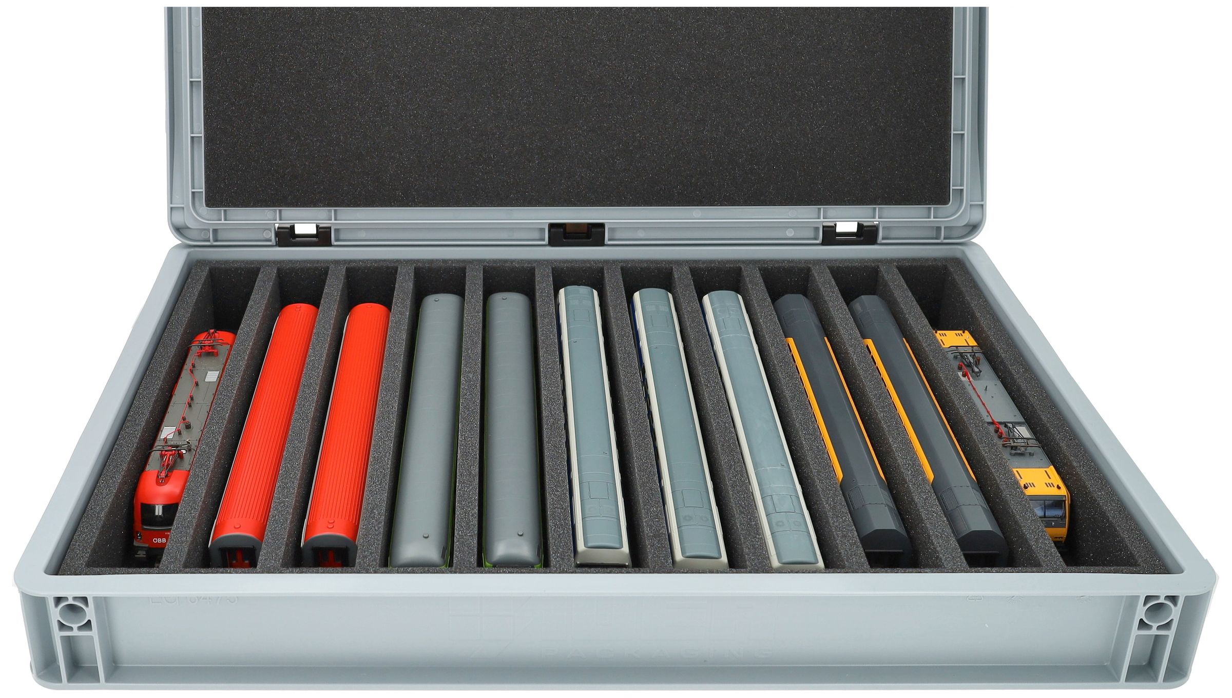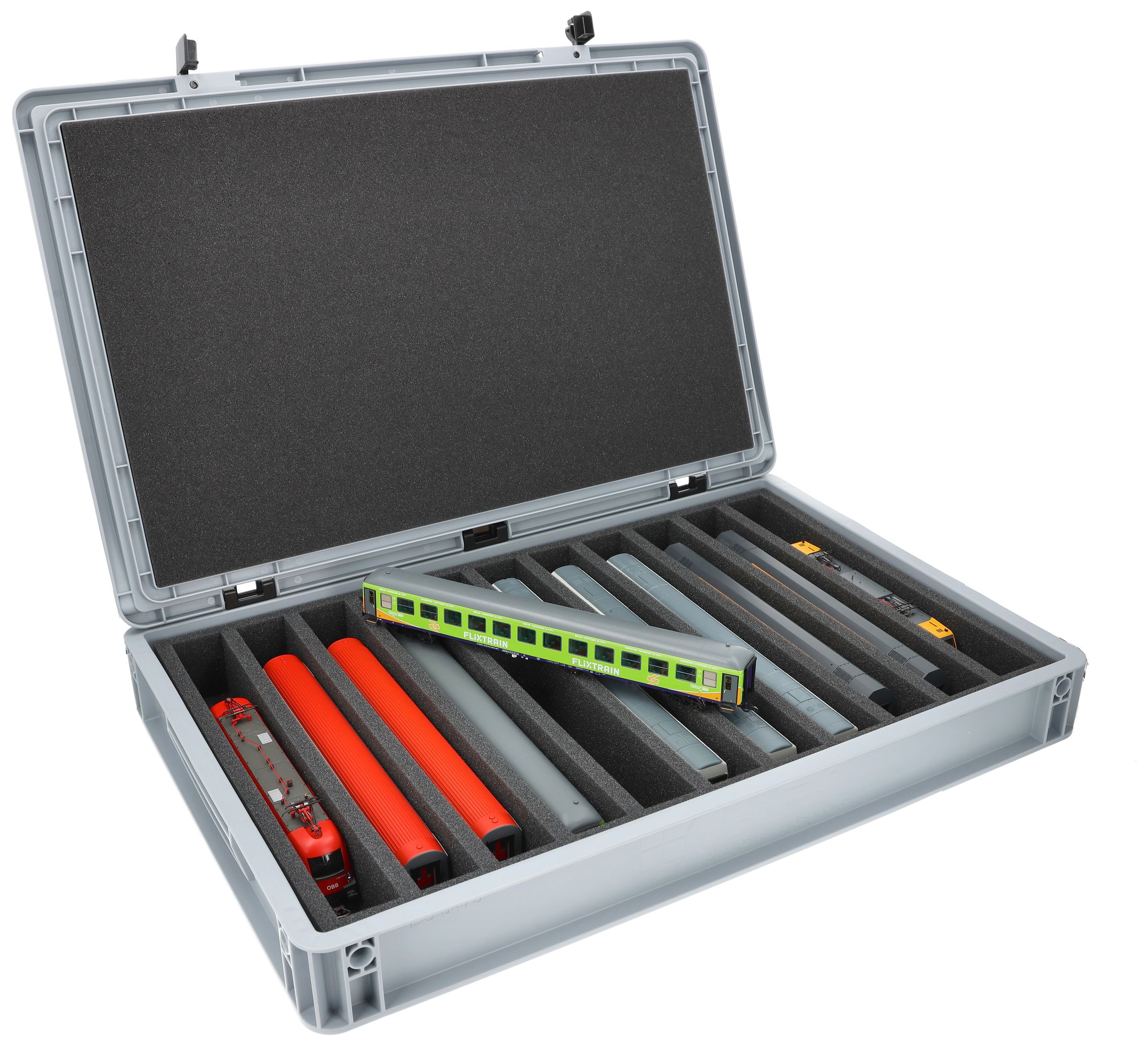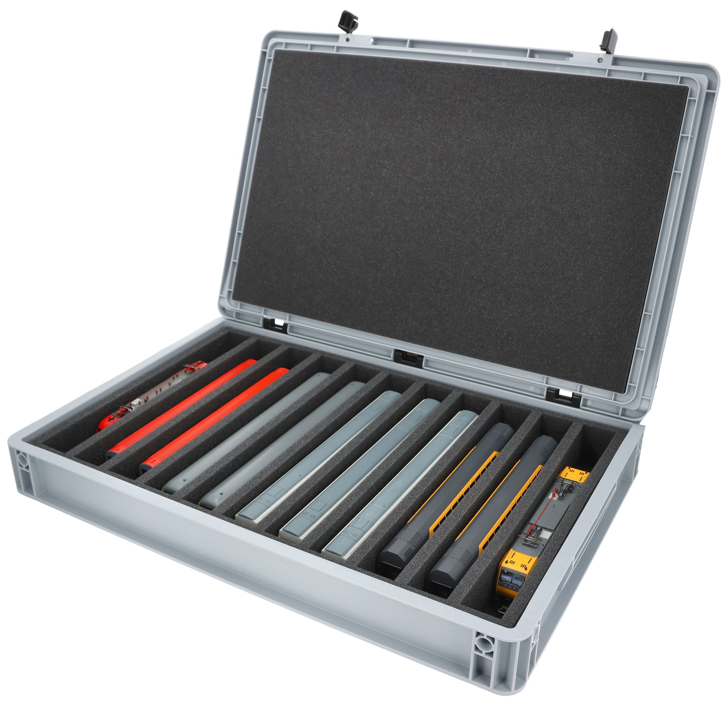 The 11 equal-sized compartments (each approx. 340 x 38 x 55 mm) are specially designed for H0 scale models. Depending on their length, several wagons or locomotives can be placed side by side. The exact fit ensures that the models are securely fixed and do not slip during transport.