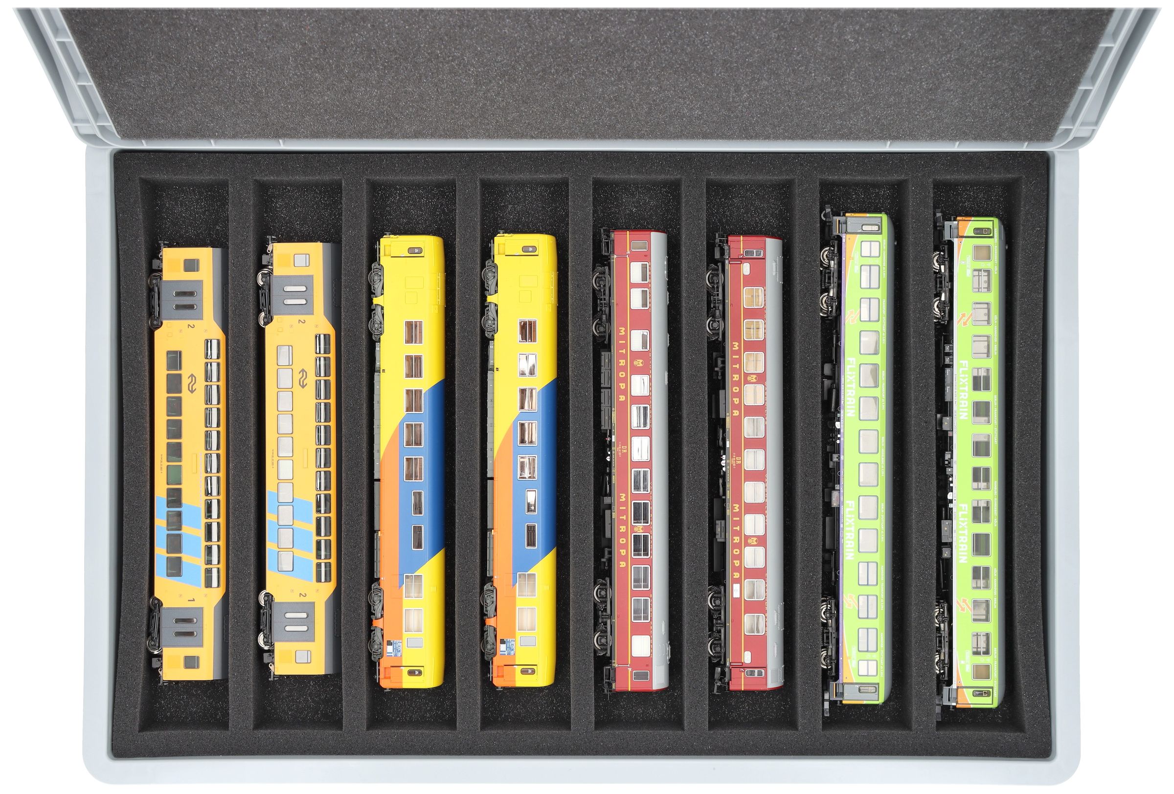 The 8 equal-sized compartments (each approx. 320 x 55 x 40 mm) are specially designed for H0 scale models. Depending on their length, locomotives and wagons can be placed side by side. The exact fit ensures that the models are securely fixed and do not slip during transport.