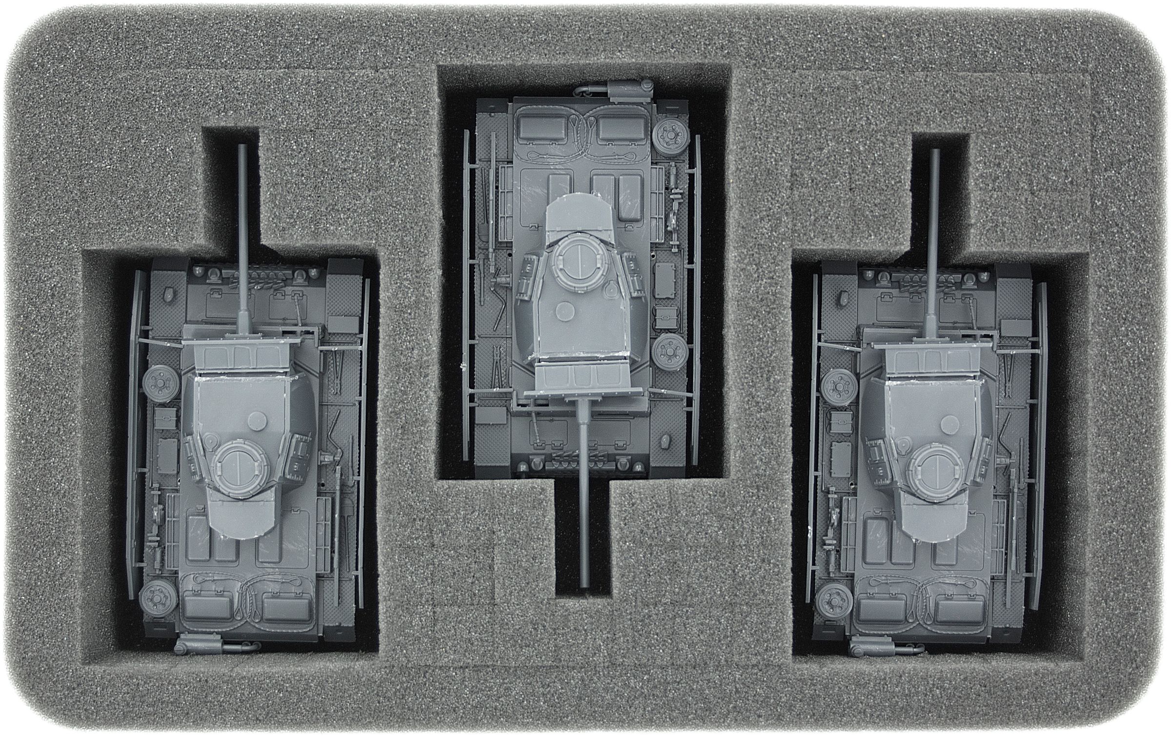 The 60 mm high foam tray is perforated with a raster. It allows you to individually remove segments with a 14 mm * 14 mm base area. You are thus enabled to configure the compartments of the trays according to sizes of your specific types of tanks and vehicles.