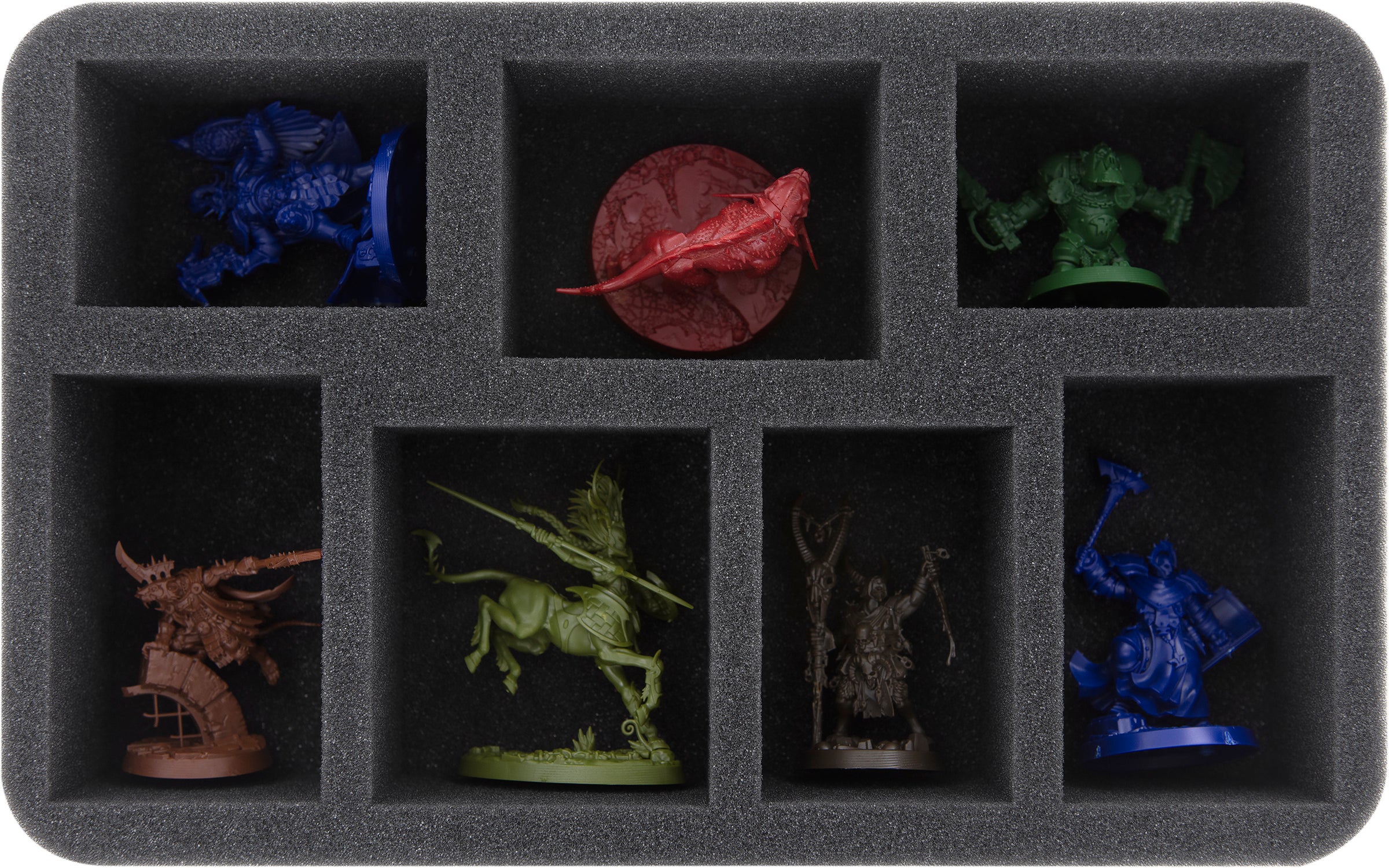 - 1 Half-Size foam tray with seven compartments for Nurglings or Putrid Blightkings + character models like Lord of Blights and miniatures with similar dimensions (HSLZ060BO)
