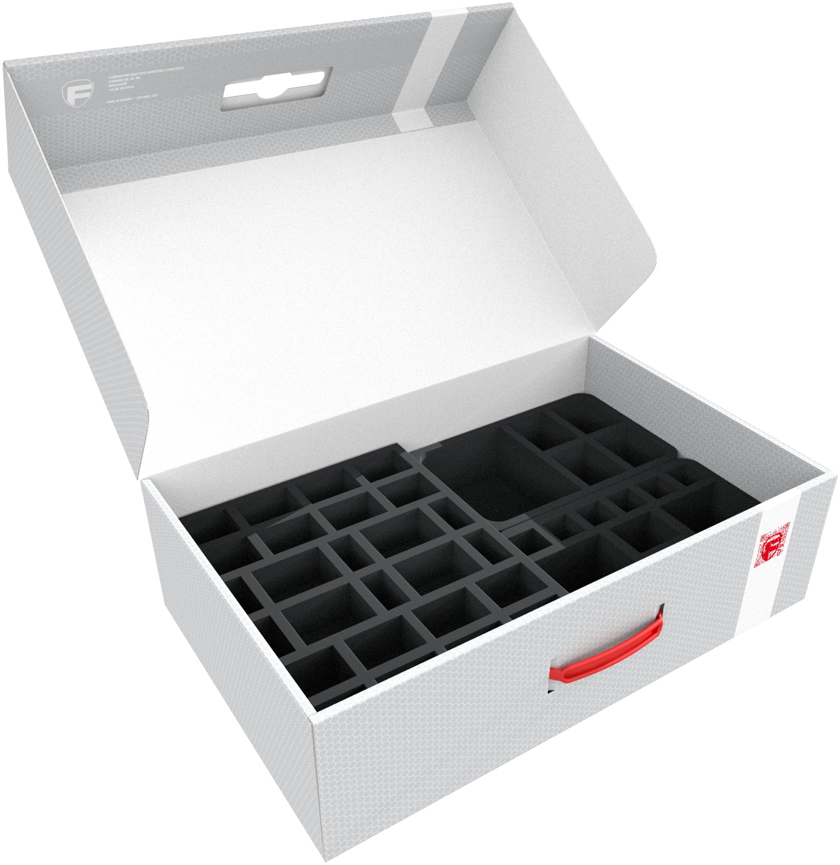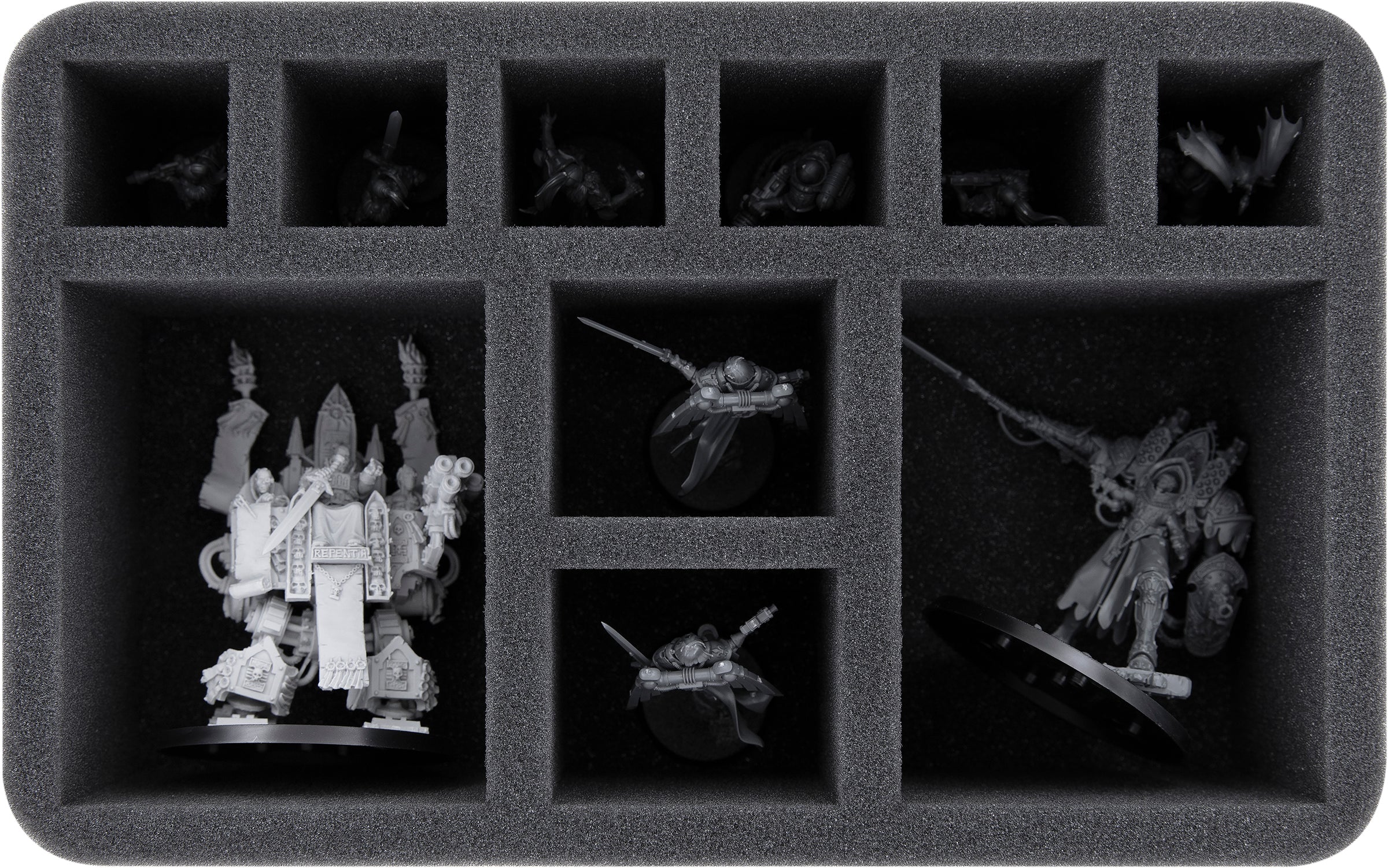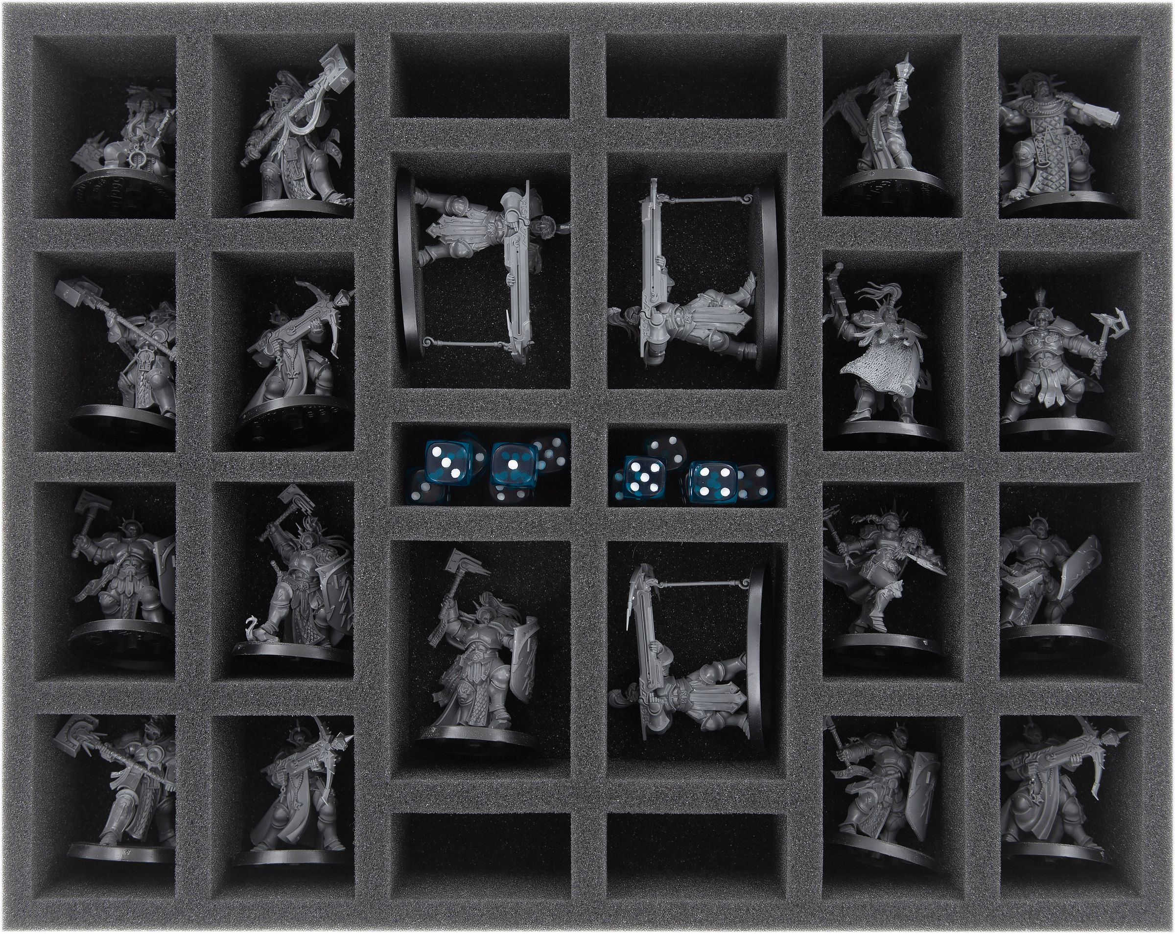 - 1 Full-Size foam tray with 26 compartments for bulky infantry models such as Geminae Superia, Battle Sisters, Arco-flagellants and models with similar dimensions (FS050A031)