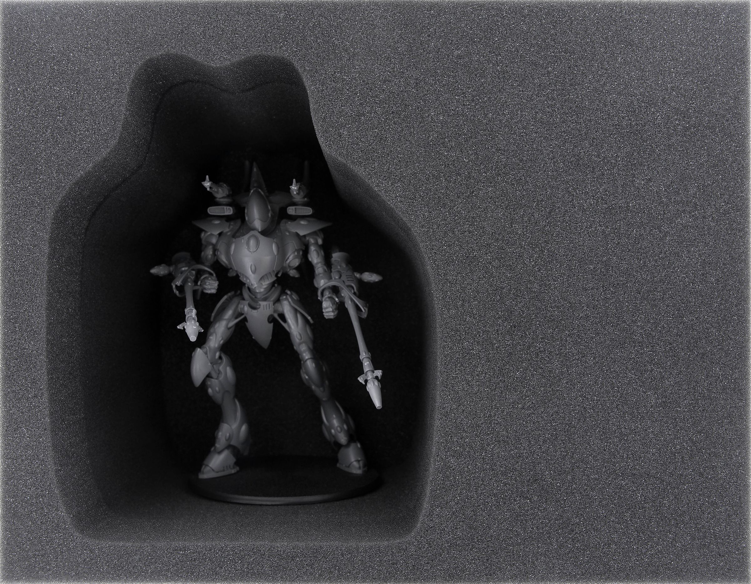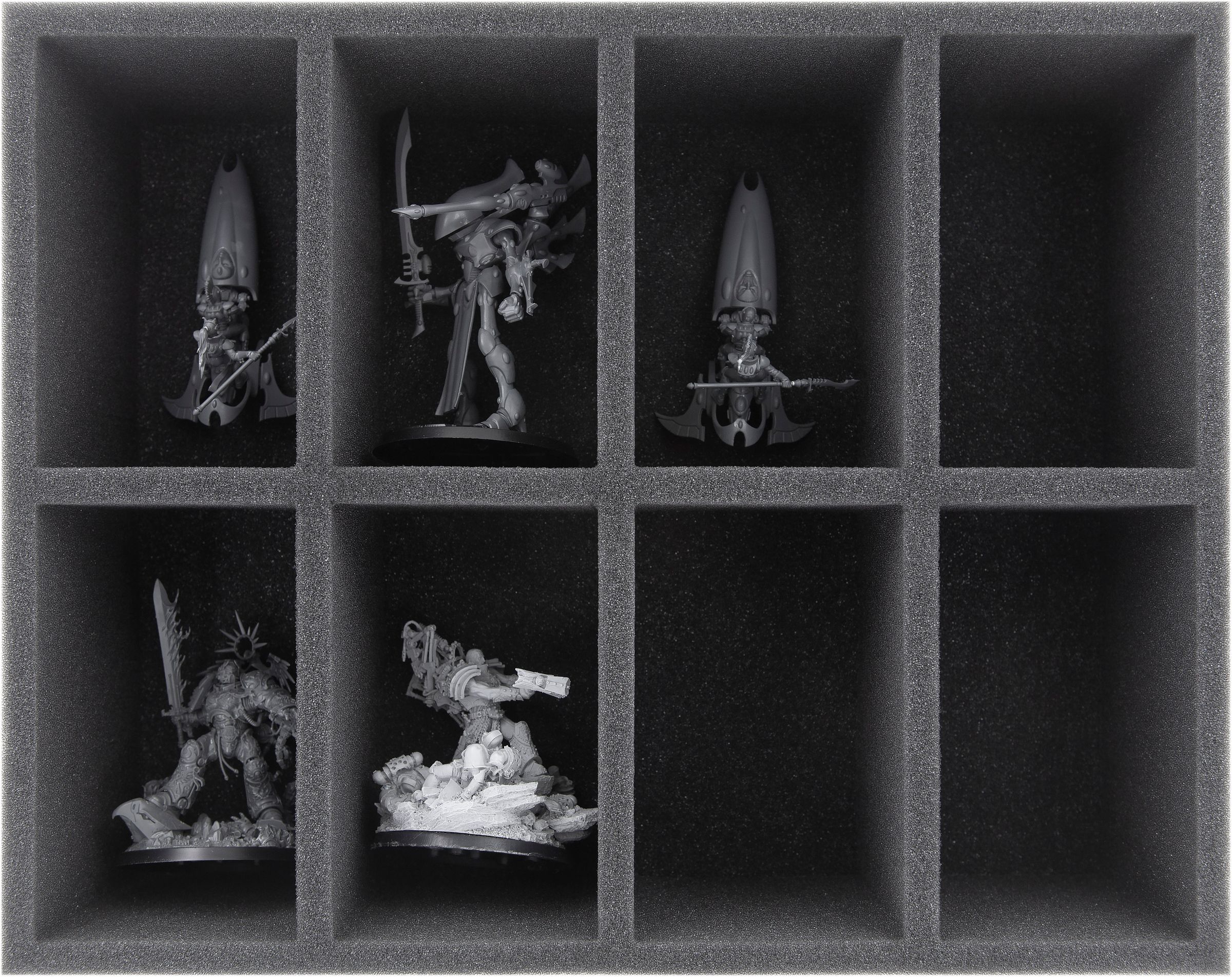 - 1 Full-Size foam tray with 8 compartments for big models like Wraithlords, units on Jetbikes like Skyrunner, Shroud Runners or Windriders and models with similar dimensions (FS090A001)