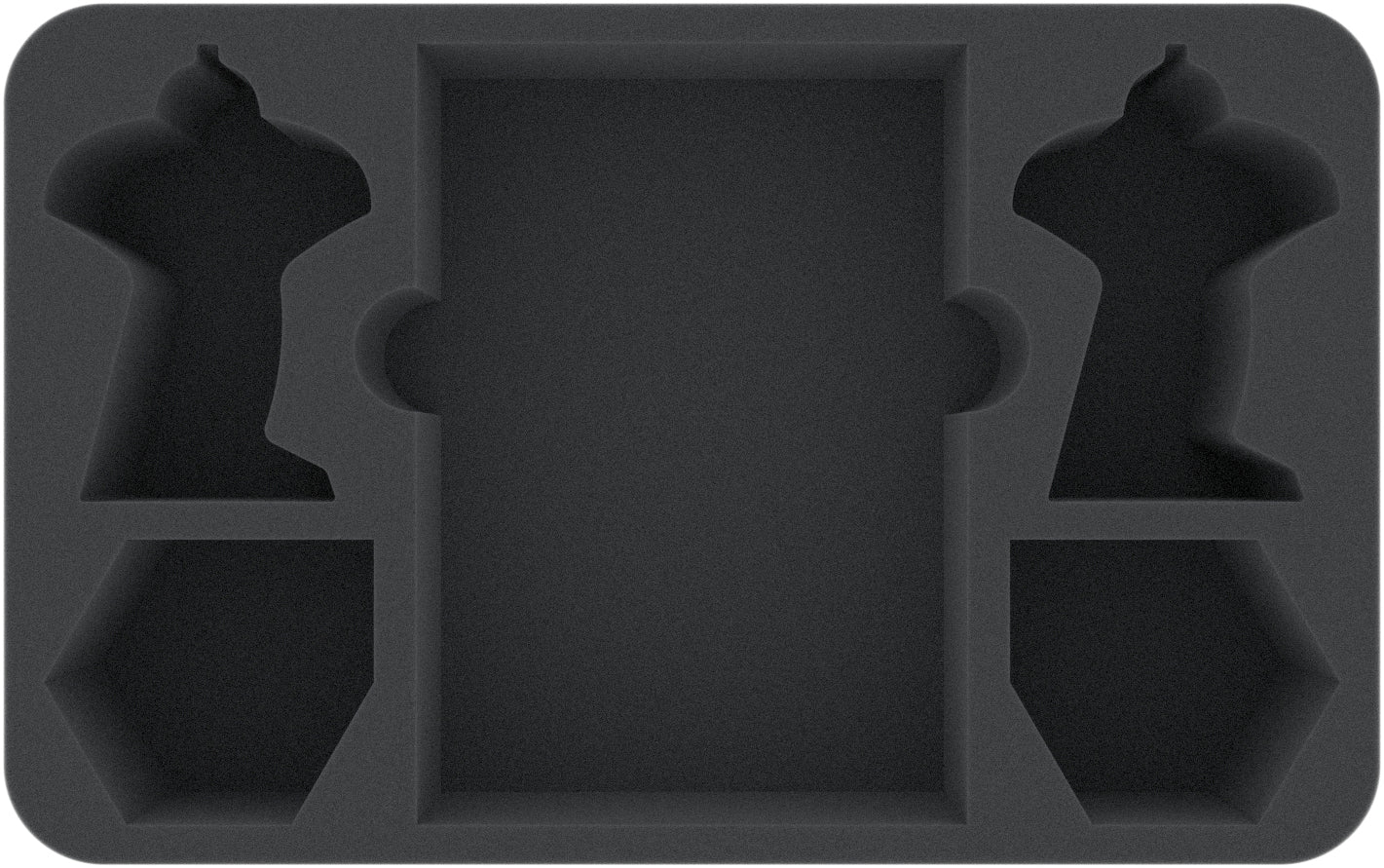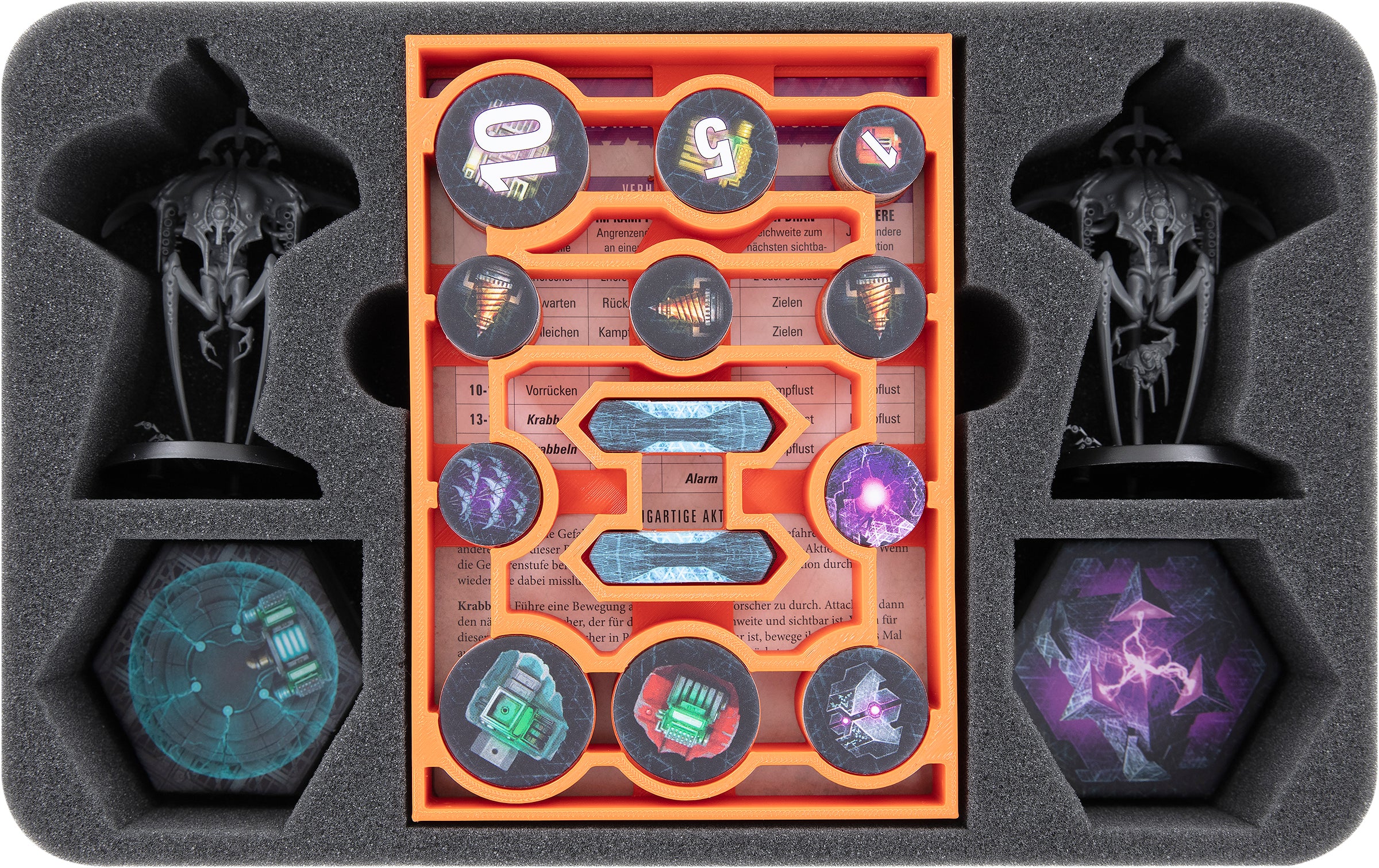 The 60 mm high foam tray (HSMEYV060BO) takes care of the miniatures and most of the game material. The two filigree models are placed in compartments cut exactly size of the miniatures. Thanks to the precisely fitting cut and the high-quality, soft foam, the sensitive details are optimally protected against breakage. Even the colors of the painted figures are protected from scratches and abrasion during transport.