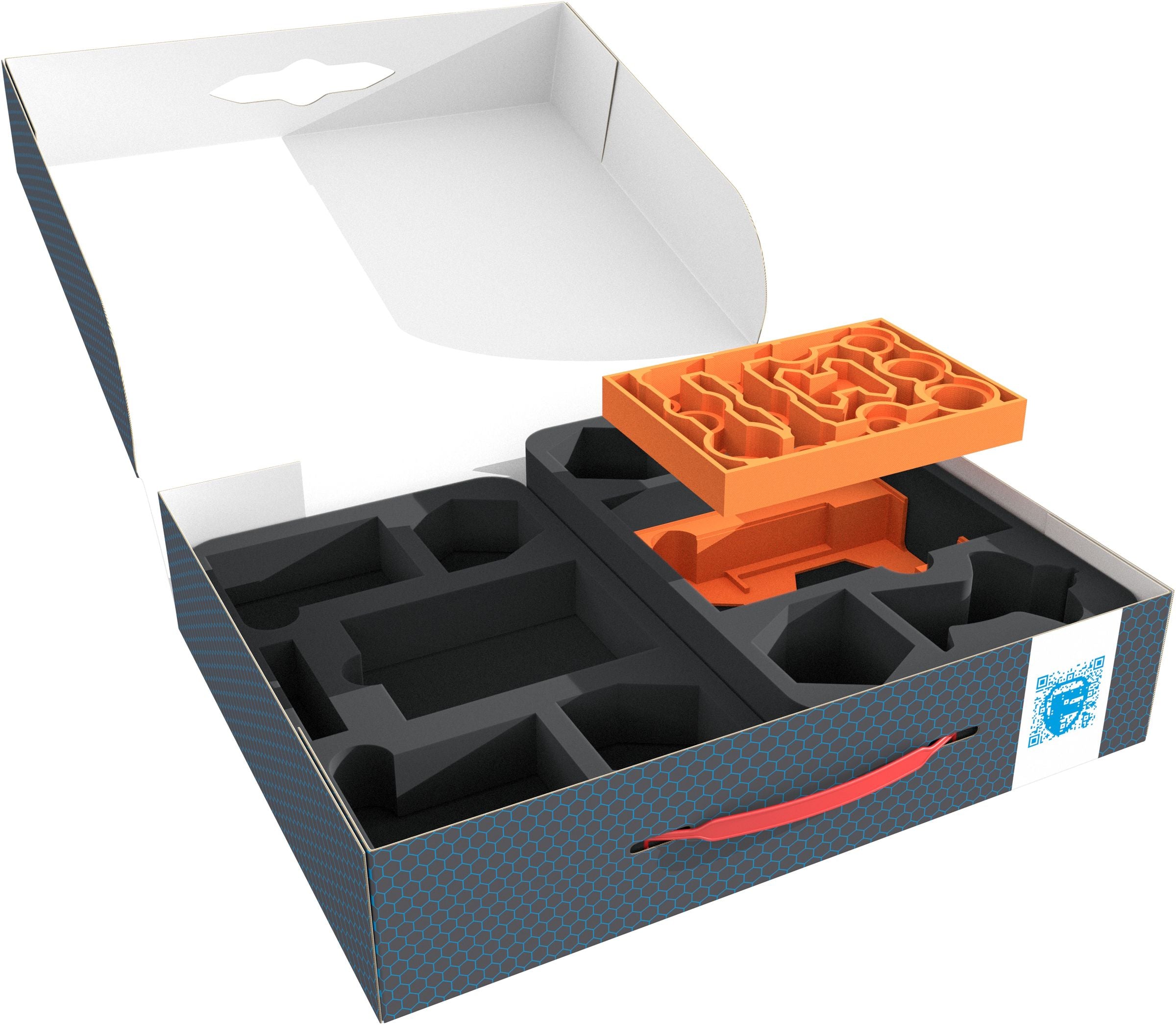 The whole thing lies securely in the Feldherr Storage Box FSLB075. The box is made of coated, double-walled cardboard. This makes it not only pleasantly light but also particularly tear-resistant and stable. Your models and material can thus be stored safely and dust-protected. The plastic carrying handle makes transporting easy.