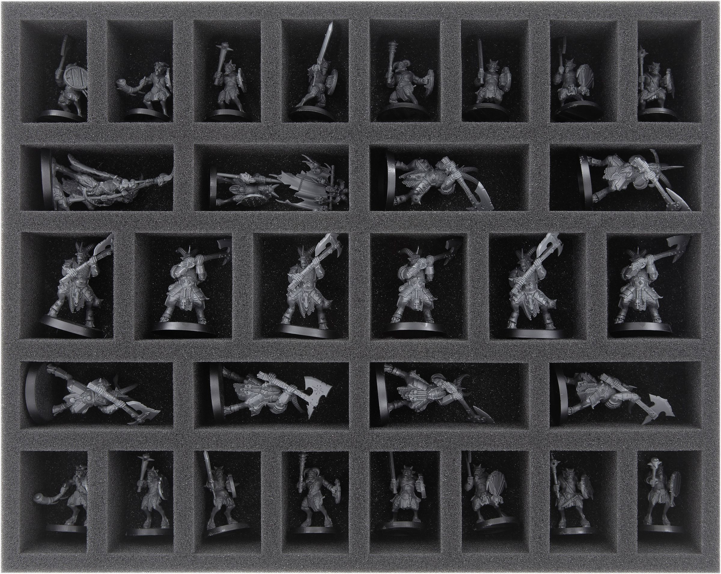 2 Full-Size and 2 Half-Size foam trays provide optimal protection for your models. Each model has its own custom-fitted compartment. The custom-fit cut ensures the miniatures stay securely in place while transported, even during the Reign of Blood. Delicate details like weapons and intricate decorations are well-guarded against damage. The soft foam preserves the colors of your painted models and protects them from scratches and paint abrasion.