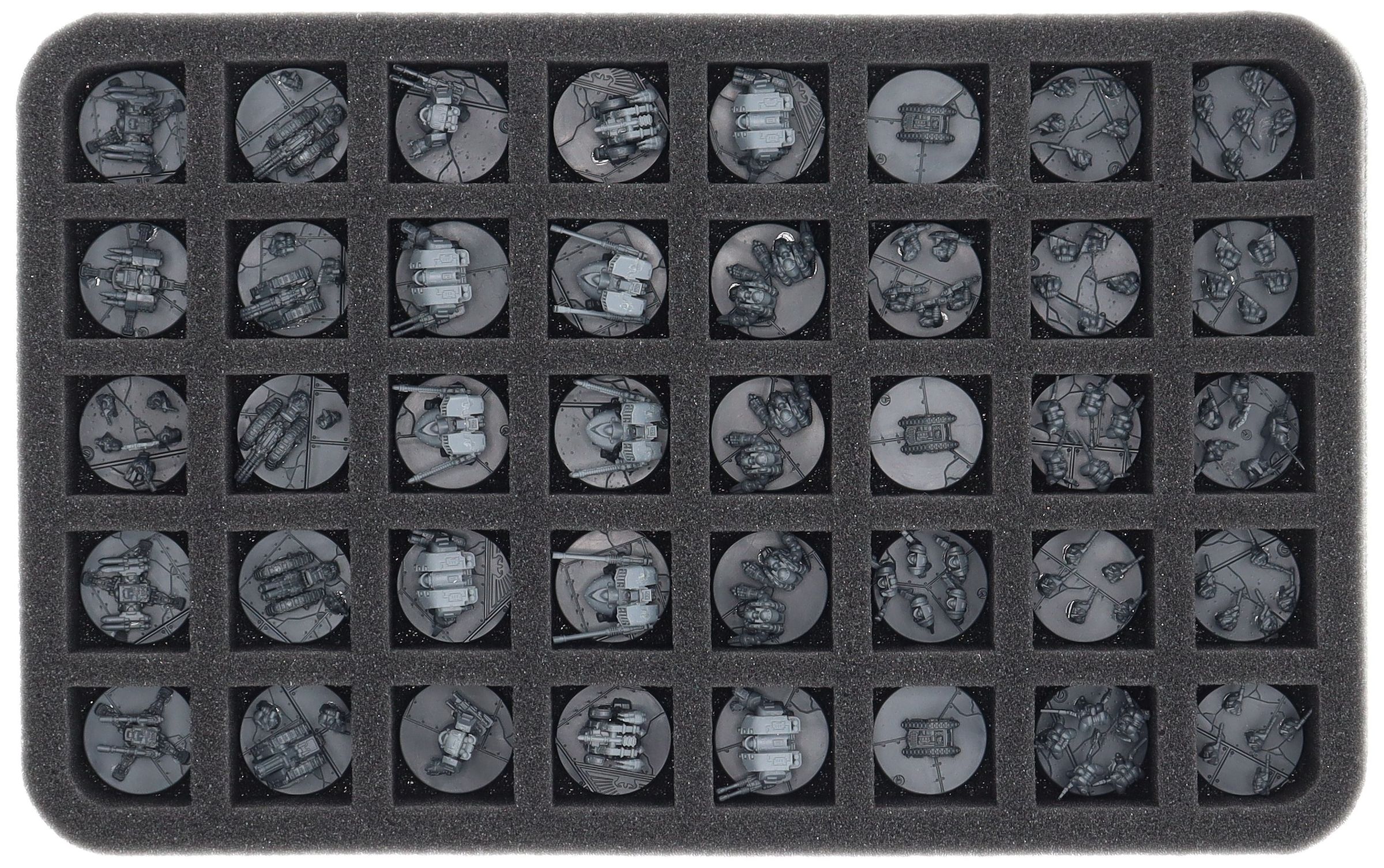 - 2 Half-Size foam trays each with 40 compartments for Space Marines, Leviathan Dreadnoughts, Legion Rapier, Legion Tarantula, Auxilia Rapier, Auxilia Tarantula, Solar Auxilia Cyclops and models with similar dimensions (HS035A071)