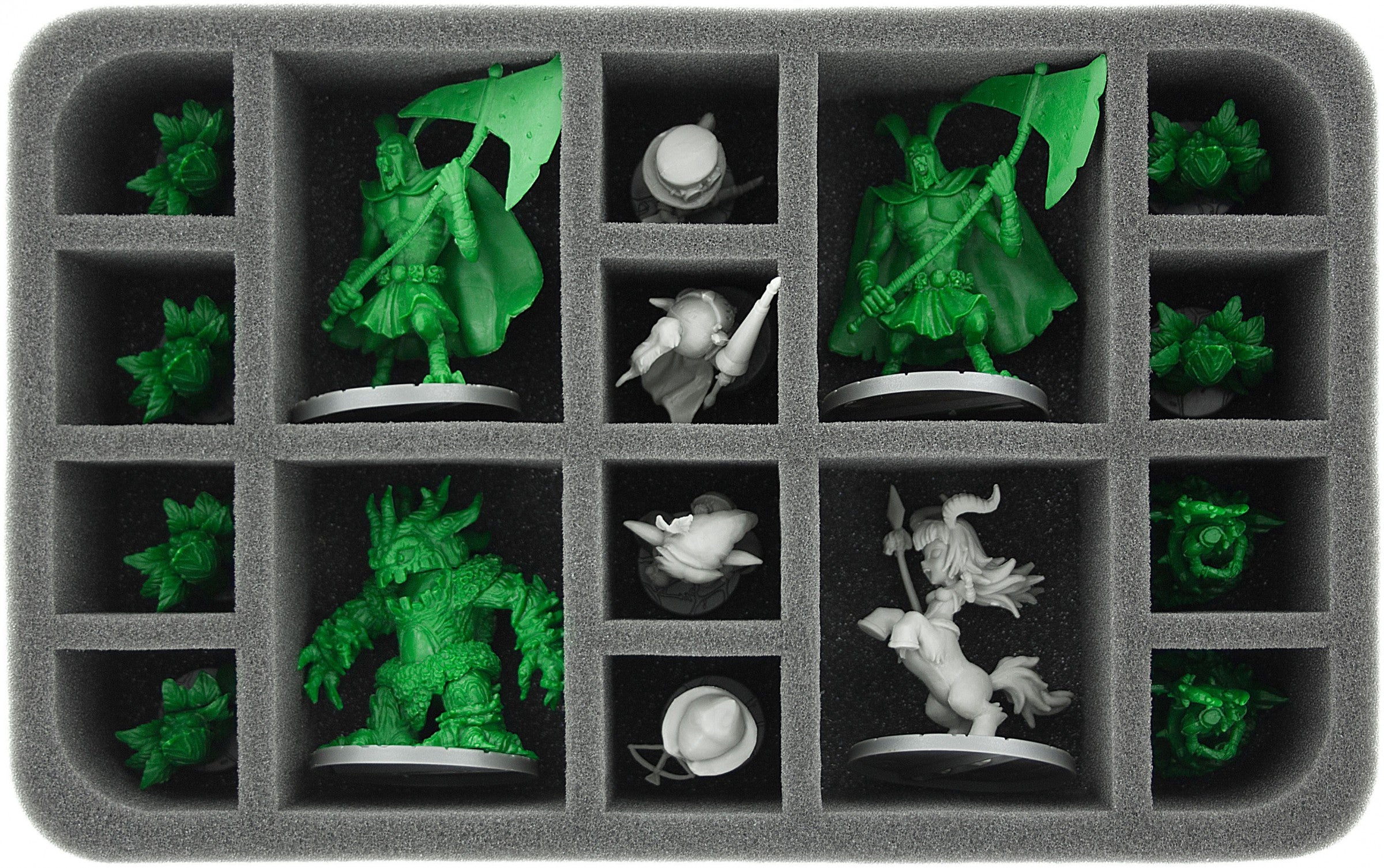 Spezielle Schaumstoffeinlage für Super Dungeon Explore mit 16 Fächern. Davon 4 größere Fächer für große Monster.