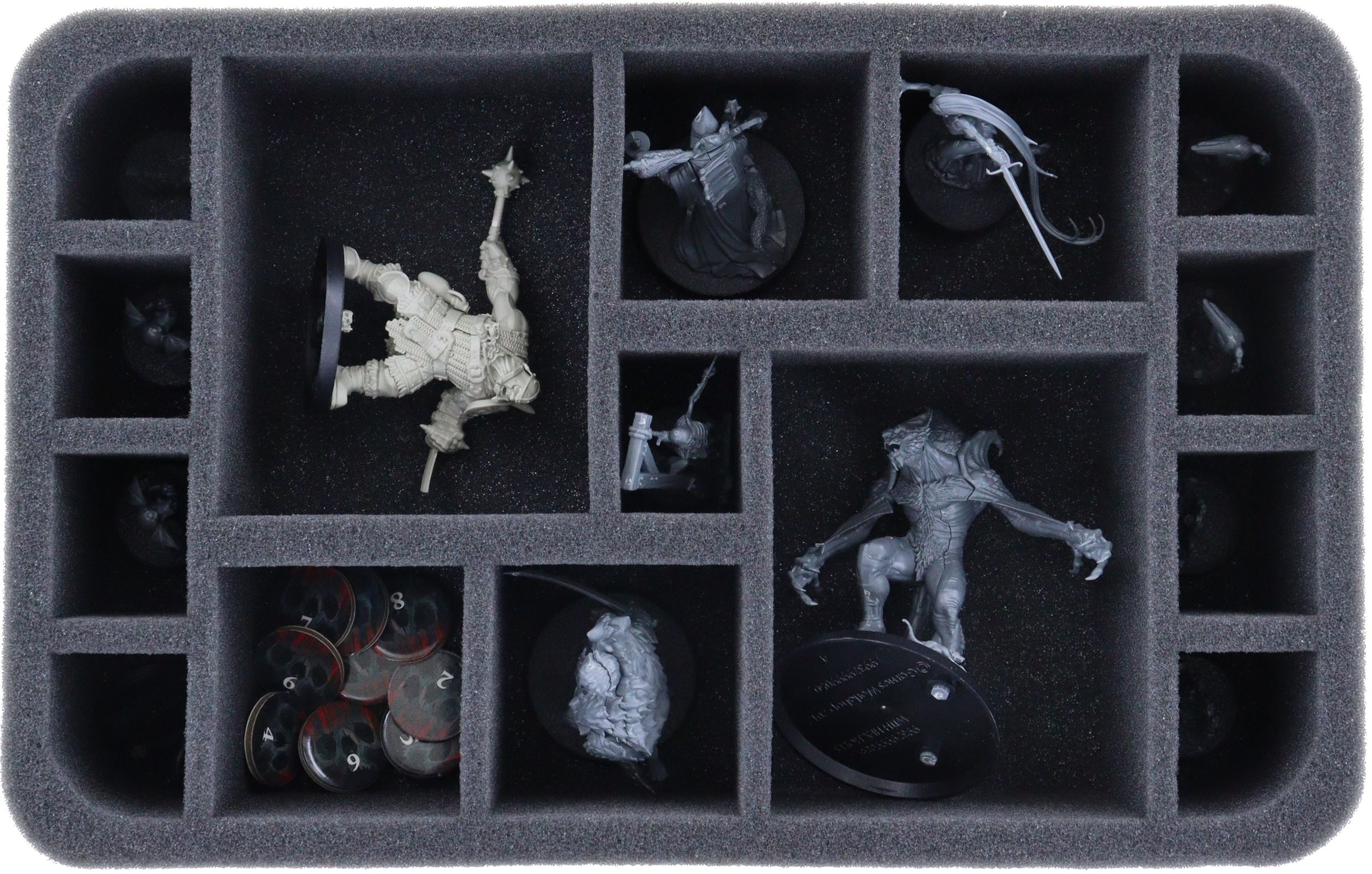 - 1 Half-Size foam tray with 15 compartments for large infantry like Radukar the Beast, Brutogg Corpse-Eater + standard infantry like Radukar, Qulathis the Exile + mysterious objects like Gnawbone Strays, gallows + similar sized models (HSMEDR065BO)
