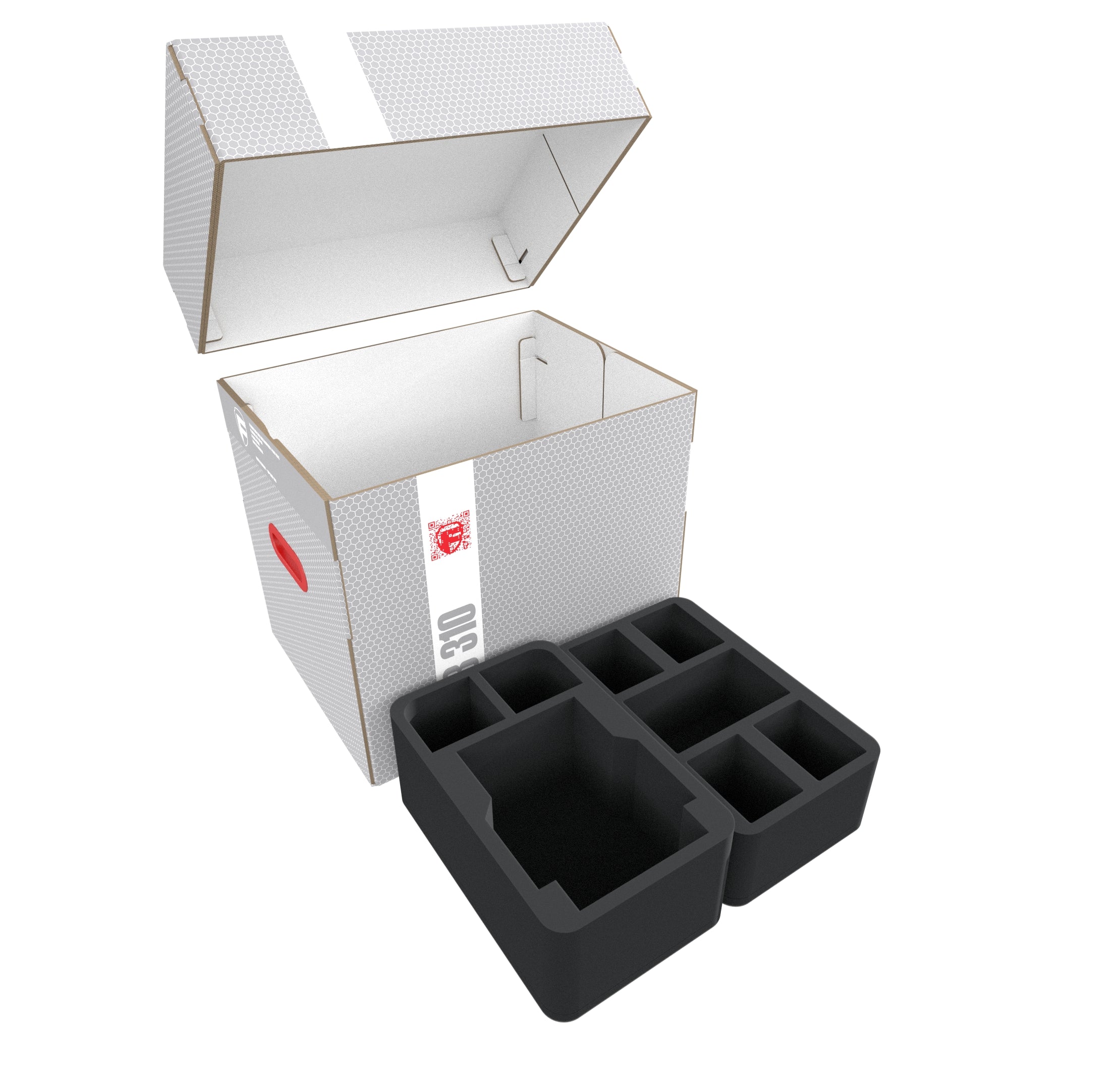The Storage Box FSLB310 is made of coated, double-walled cardboard. This makes it not only pleasantly light but also very tear-resistant and stable. The attachable lid reliably protects the contents from dust and other external influences. With the appropriate foam trays, miniatures, game material, and all other goods can be stored safely — and conveniently transported with the two plastic-reinforced carrying handles on the sides.