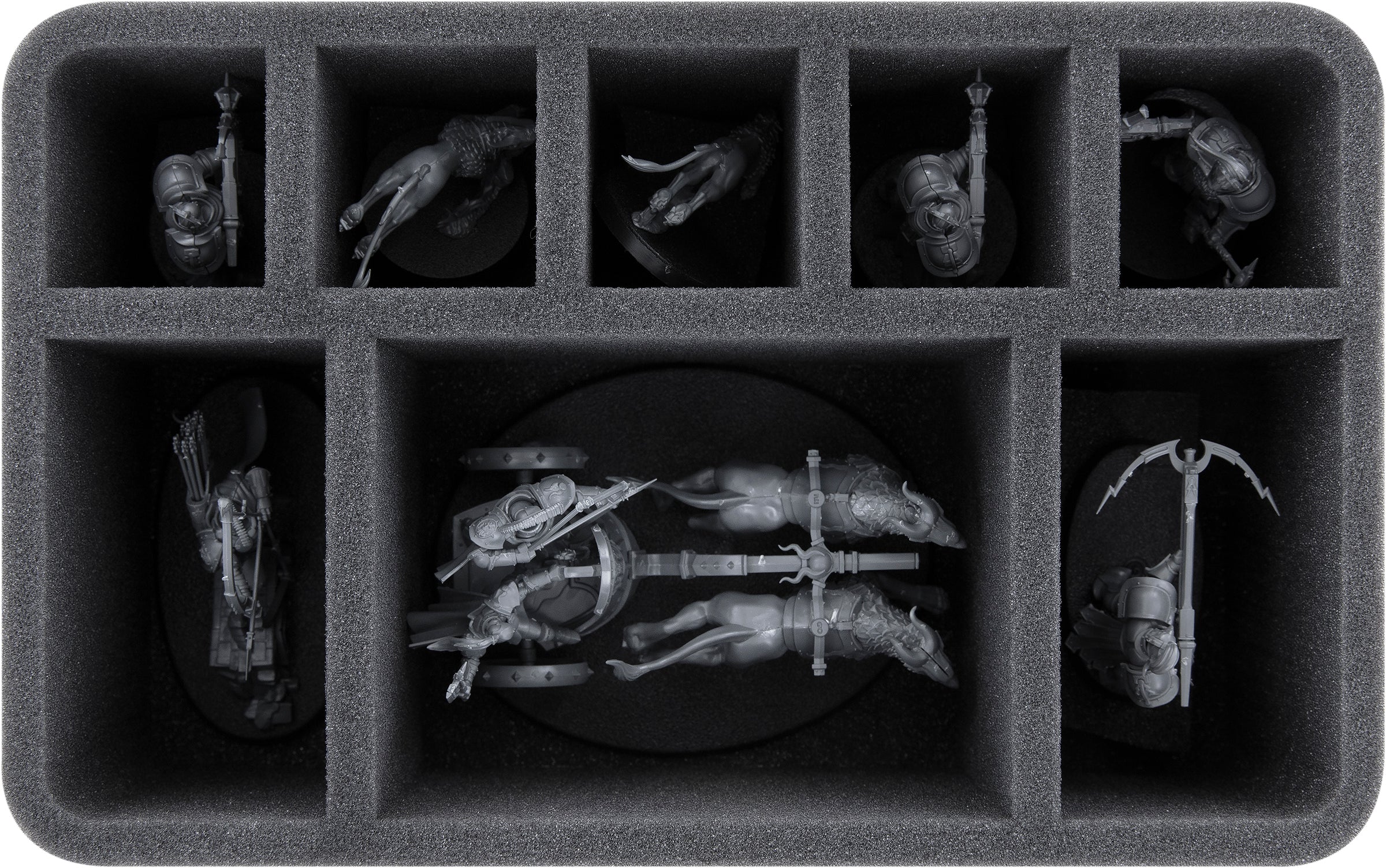 - 1 Half-Size foam tray with 8 compartments for e.g. Centaurion Marshal, Chaos Chariot or Gore Beast Chariot + Chaos Spawns (HS095A002)