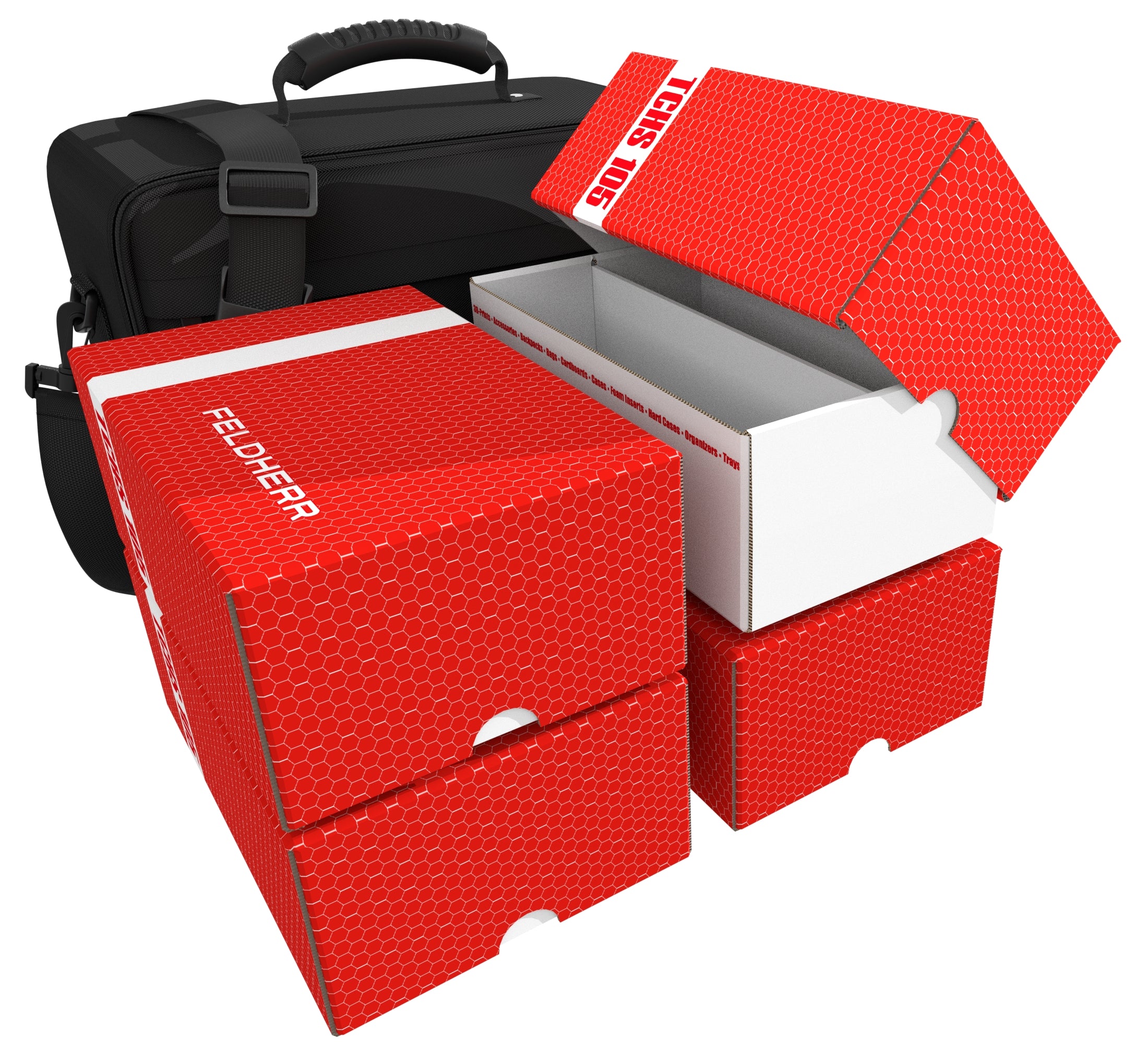 - The four stackable card boxes fit perfectly in the Feldherr MAXI PLUS bag and hold up to 1600 cards each (900 with protective sleeves*).