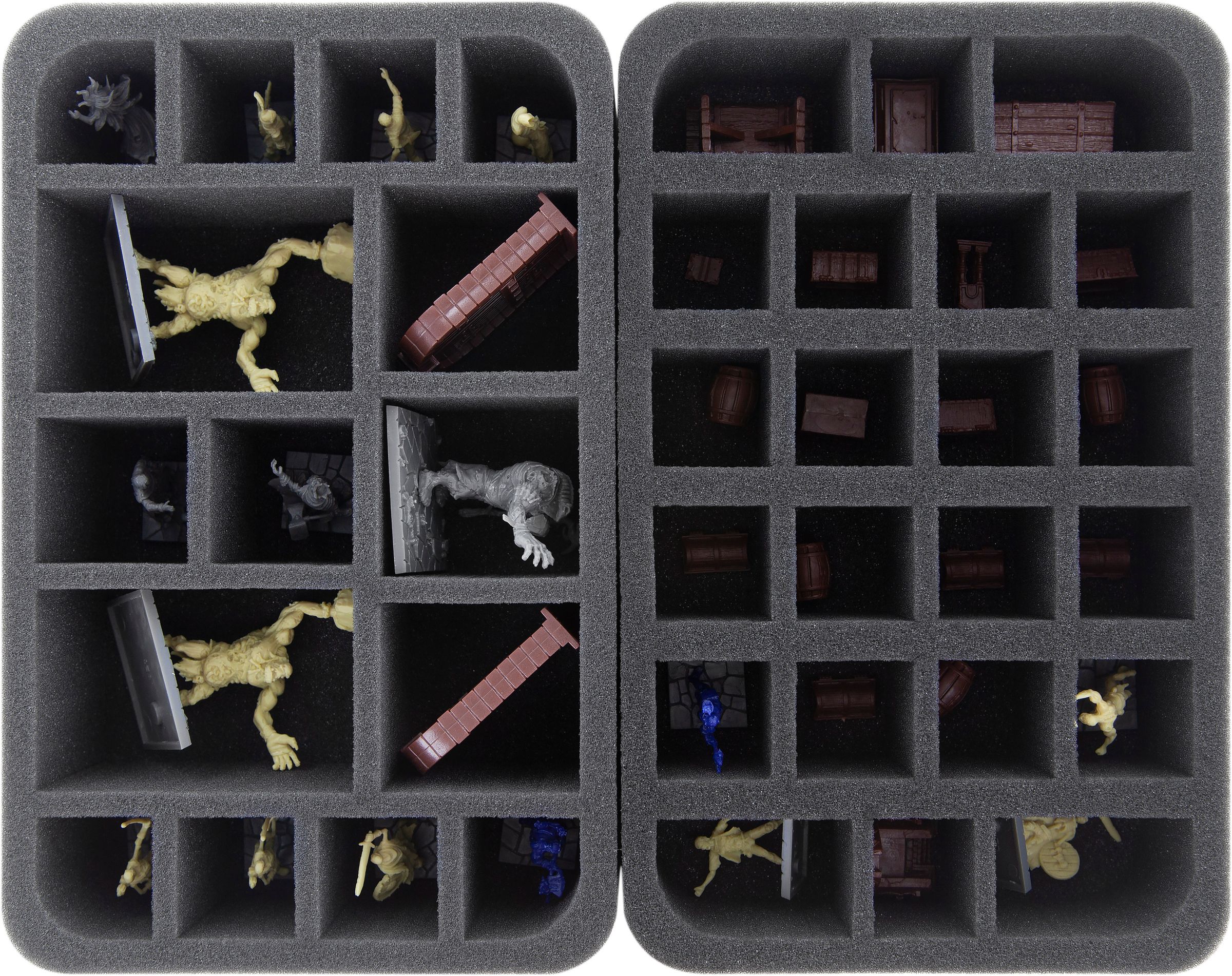 The sturdy bag is filled with 5 matching foam trays for the miniatures, markers, (sleeved) cards and dice of the exciting game. You have thus properly sorted your game material and everything is always at hand. The fine-pored foam provides reliable protection – delicate parts like the scythes of the Skeleton Warriors are safe from breaking, surfaces do not get scratched. Additionally, the set contains two foam toppers – one for leveling the foam tray stacks in the bag, the other as cover to ensure nothing falls out during transport.