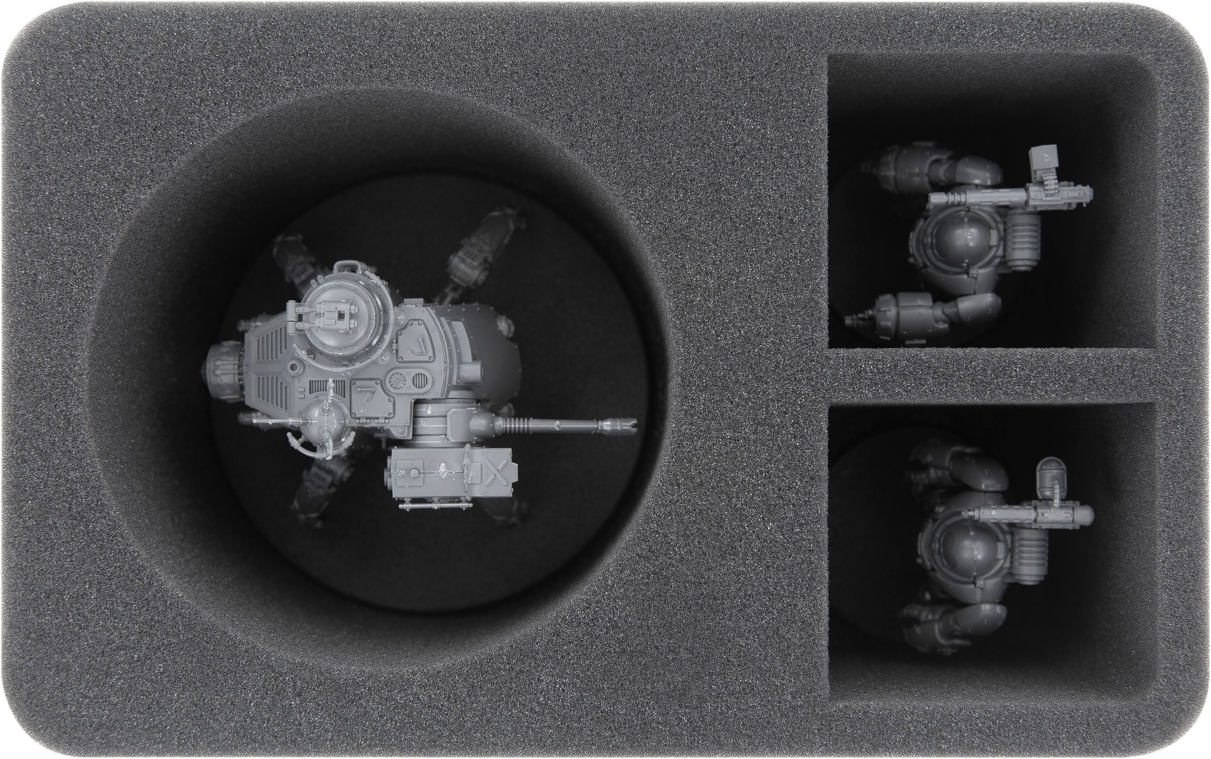 The foam tray for the Onager Duncecrawler features one large, round compartment for the fantastic model. Gently caressed by high-quality foam, delicate parts like legs and weapons are safe from harm, here. The two other compartments are suitable for e. g. Kastelan Robots.