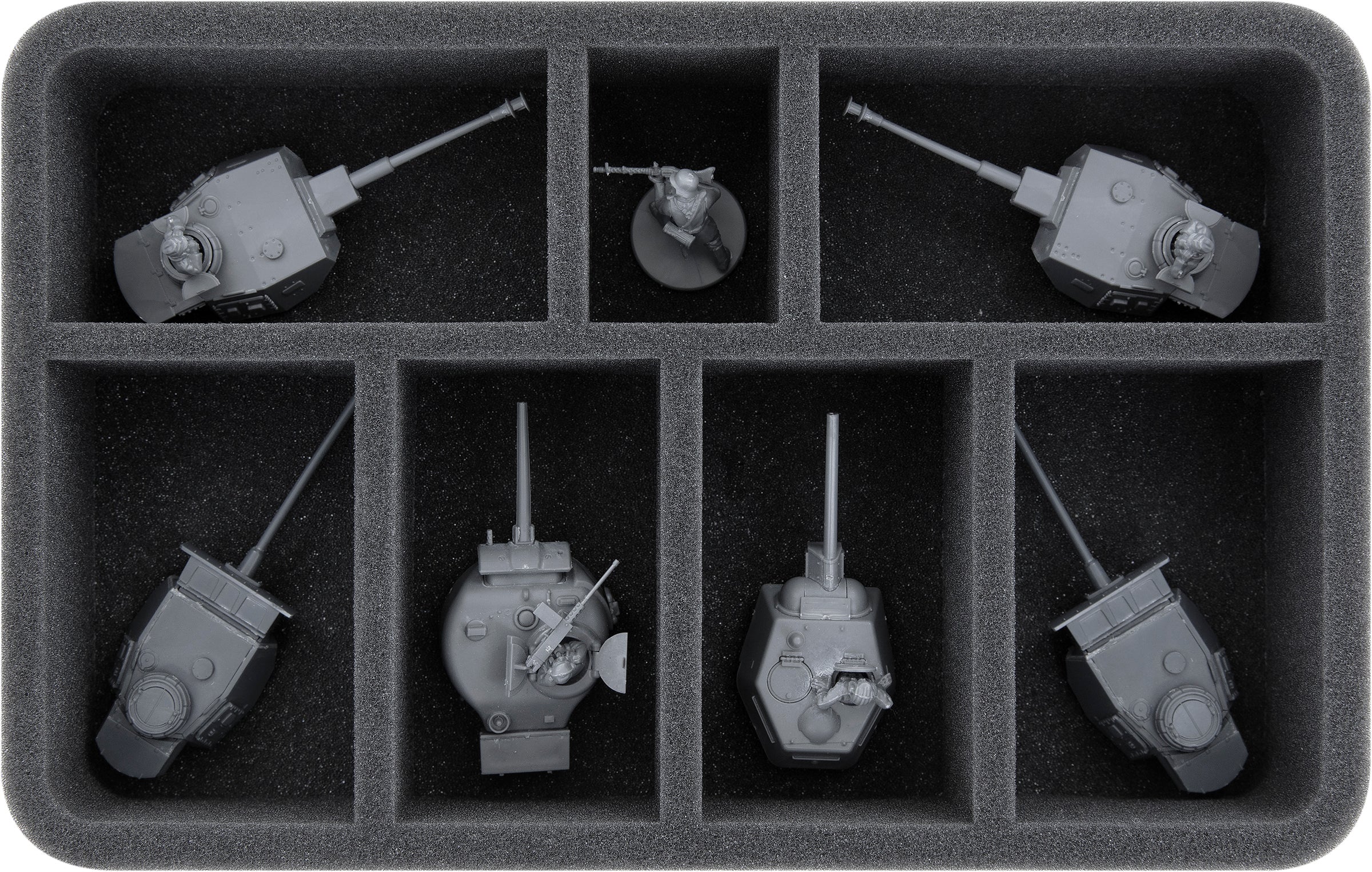 - 2 Half-Size foam trays with each 7 compartments for tank turrets suitable for the models Tank III, Tank IV, T34, M4 Sherman, Tiger + 2 infantry units (HS055A009)