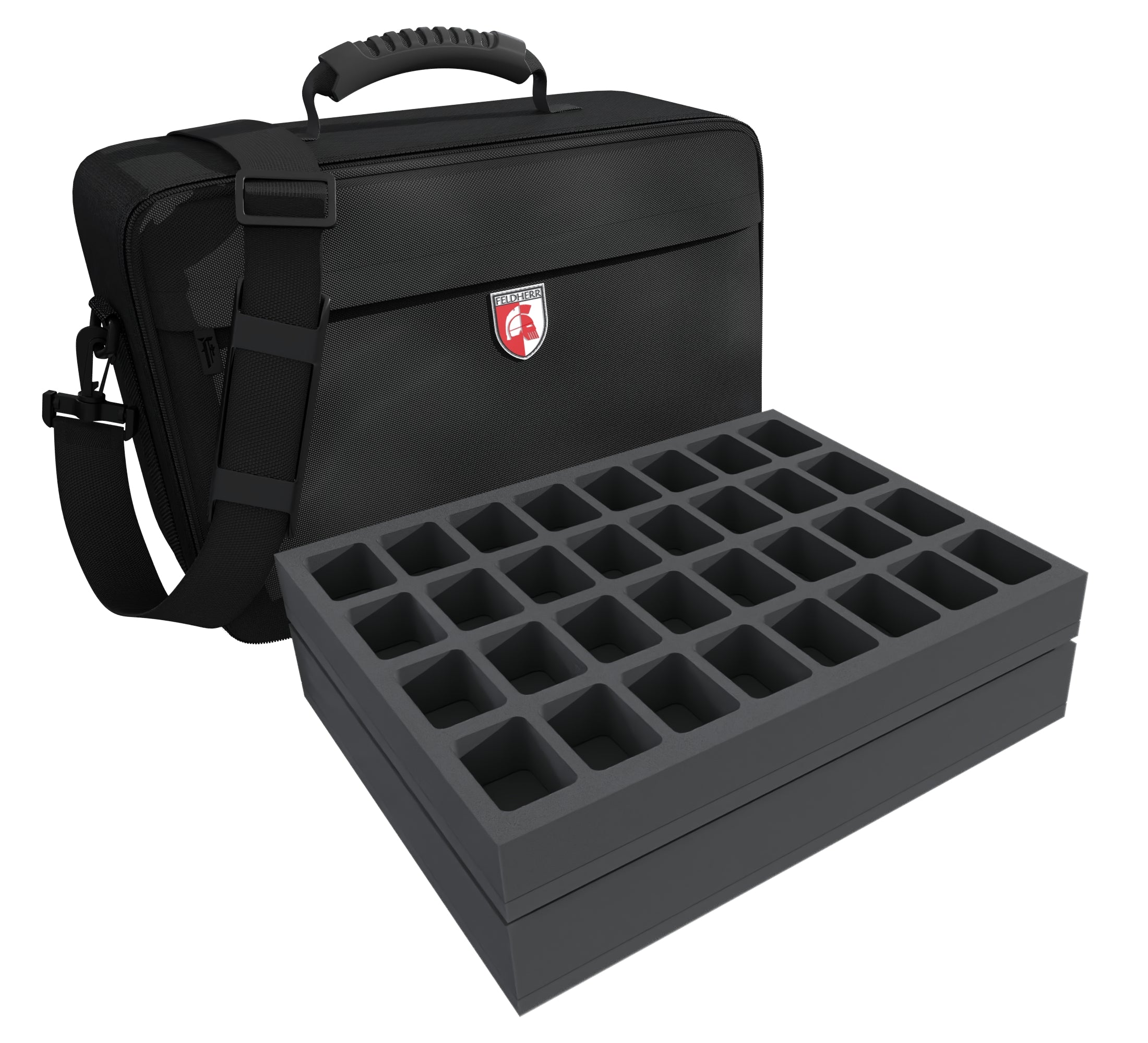 - 1 Full-Size foam tray with 32 compartments for miniatures like monsters, heroes and miniatures with similar dimensions (FSMEDS040BO)