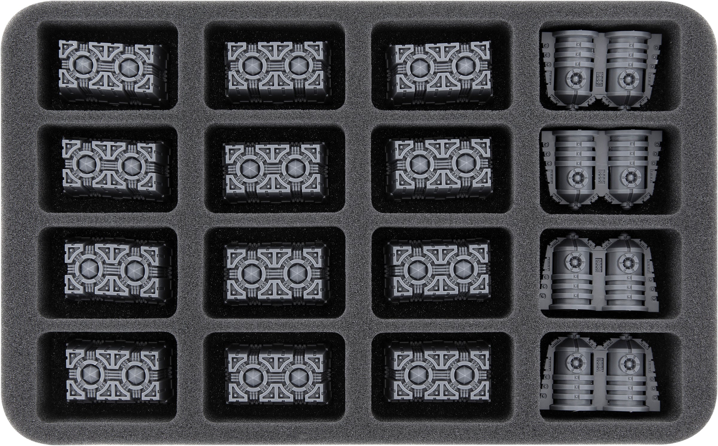 Spread across one Full-Size and five Half-Size foam trays, the game set's miniatures, terrain pieces, and mission objective cards are safely stored. Custom-fit compartments for each model ensure that the figures do not slip around or bump into each other during transport. This also keeps the paints of the painted Space Marines or Necrons safe from abrasion and scratches.