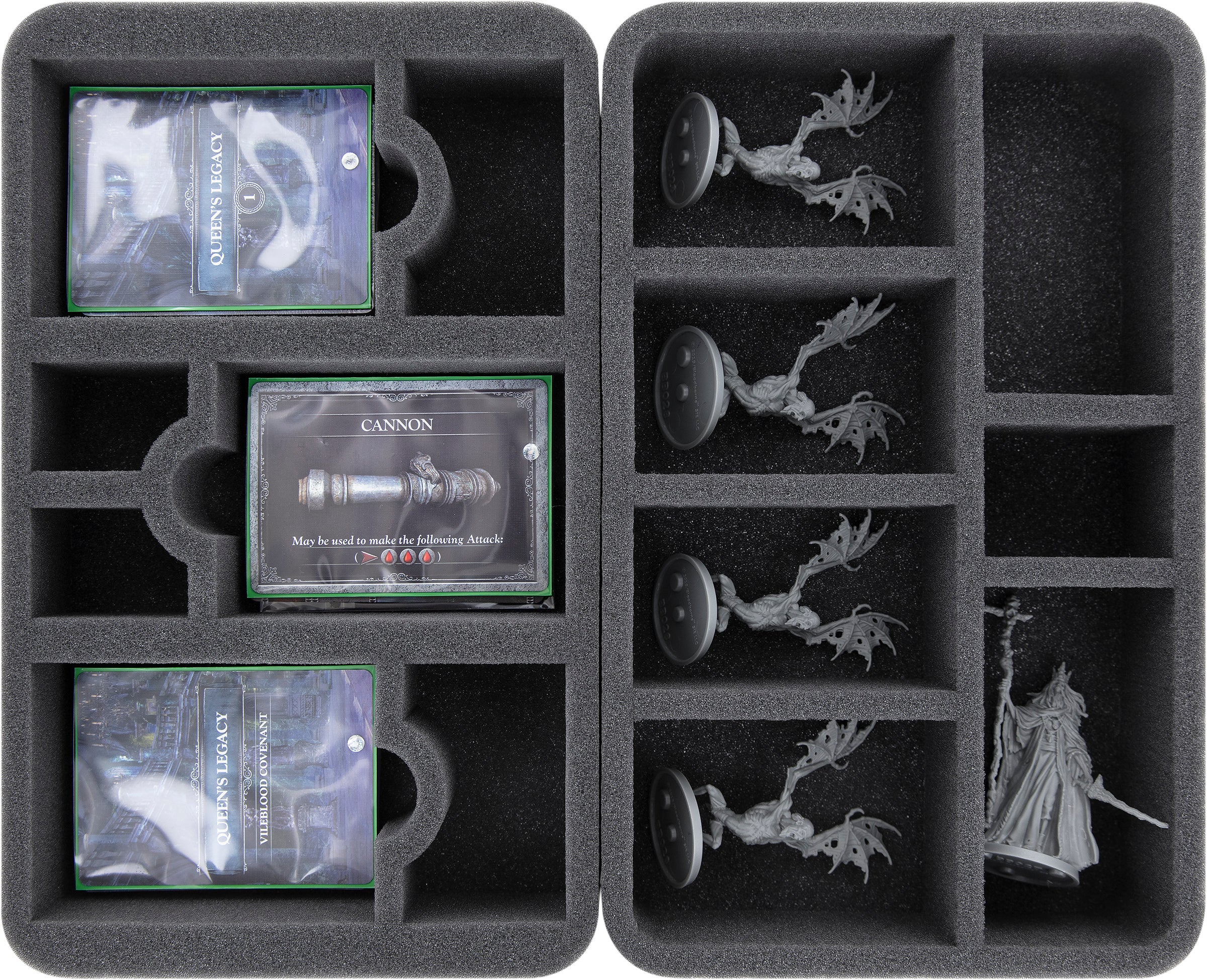 Four Half-Size foam trays offer a total of 36 compartments for your models and cards. Sublime bosses like Martyr Lorgarius and Vileblood Queen Annalize get matching compartments as well as lowly Bloodlickers. Even for the Kickstarter exclusive miniature of the Reiterpallasch Hunter, you find a quiet resting place in the inserts.