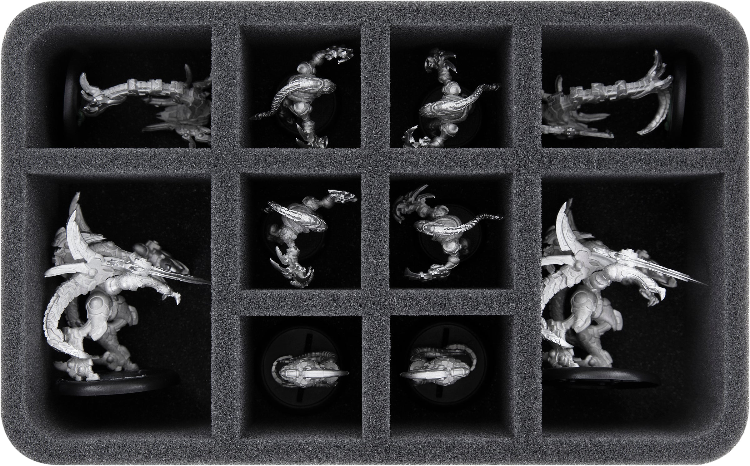 Thanks to the custom-fit cut, the miniatures have a tight fit. Even if the transport is a bit rough, the figures remain in place. The soft, fine-pored foam protects delicate details from breaking off and the colors of your painted models from scratches and paint abrasion.