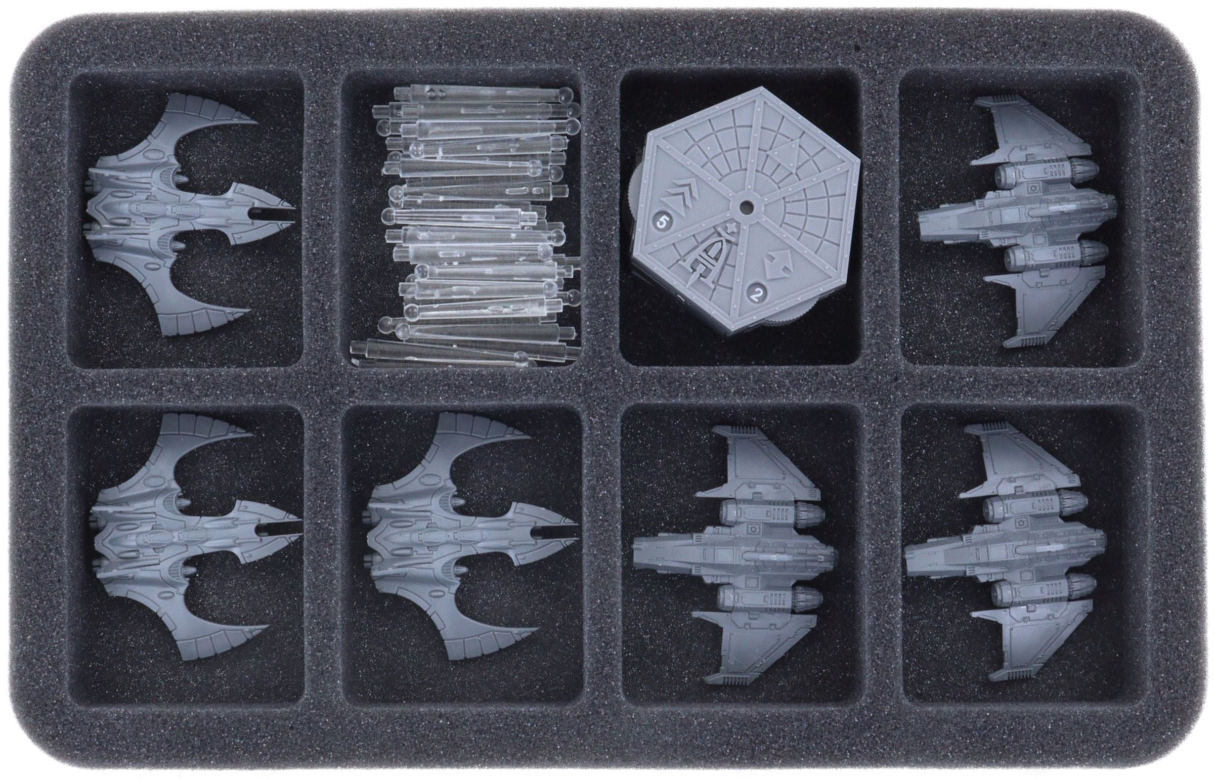 - 2 Half-Size foam trays, each with eight compartments for Nightwings, Phoenix Bombers, flight bases, and flight sticks (HS035A046)